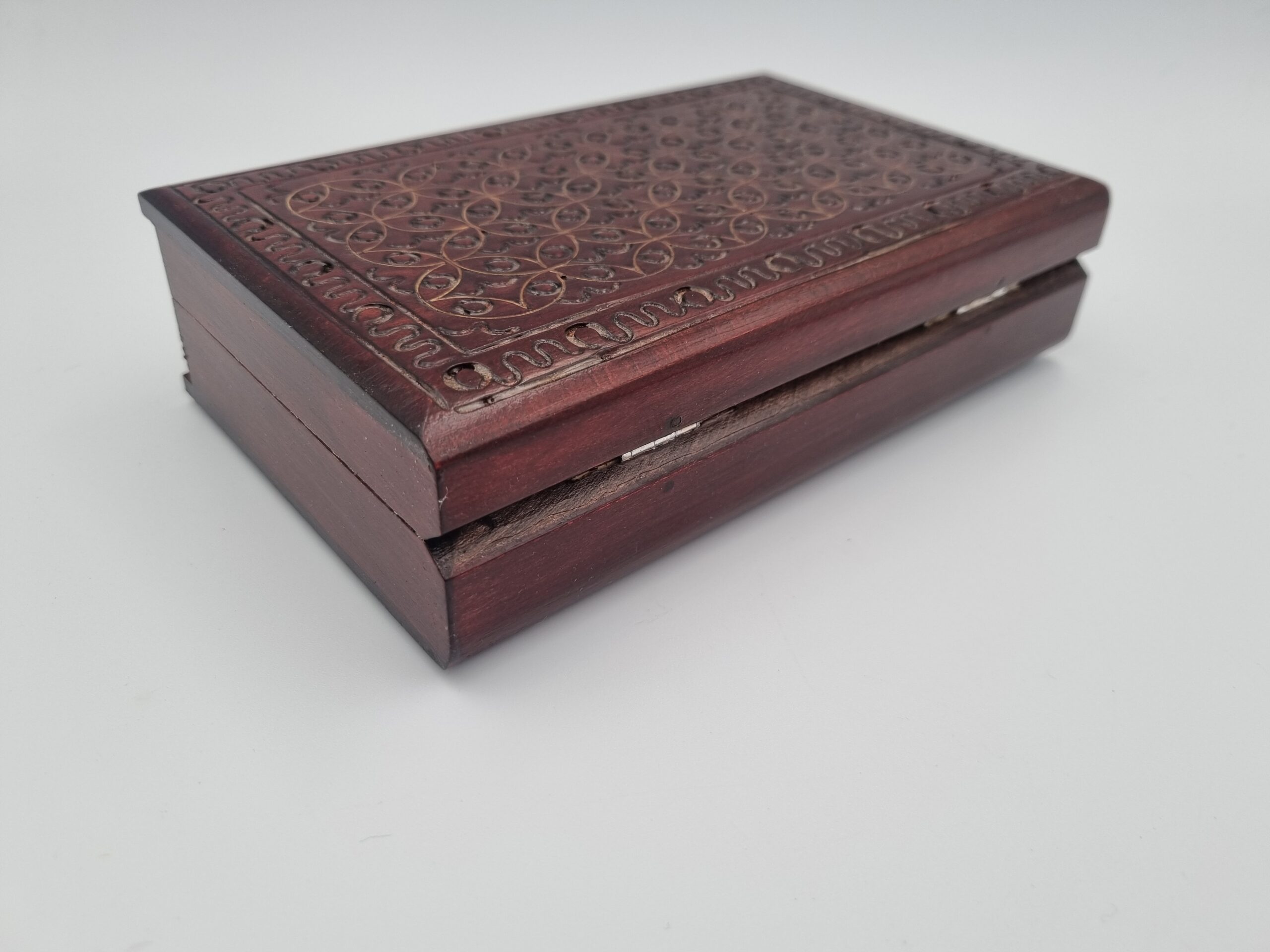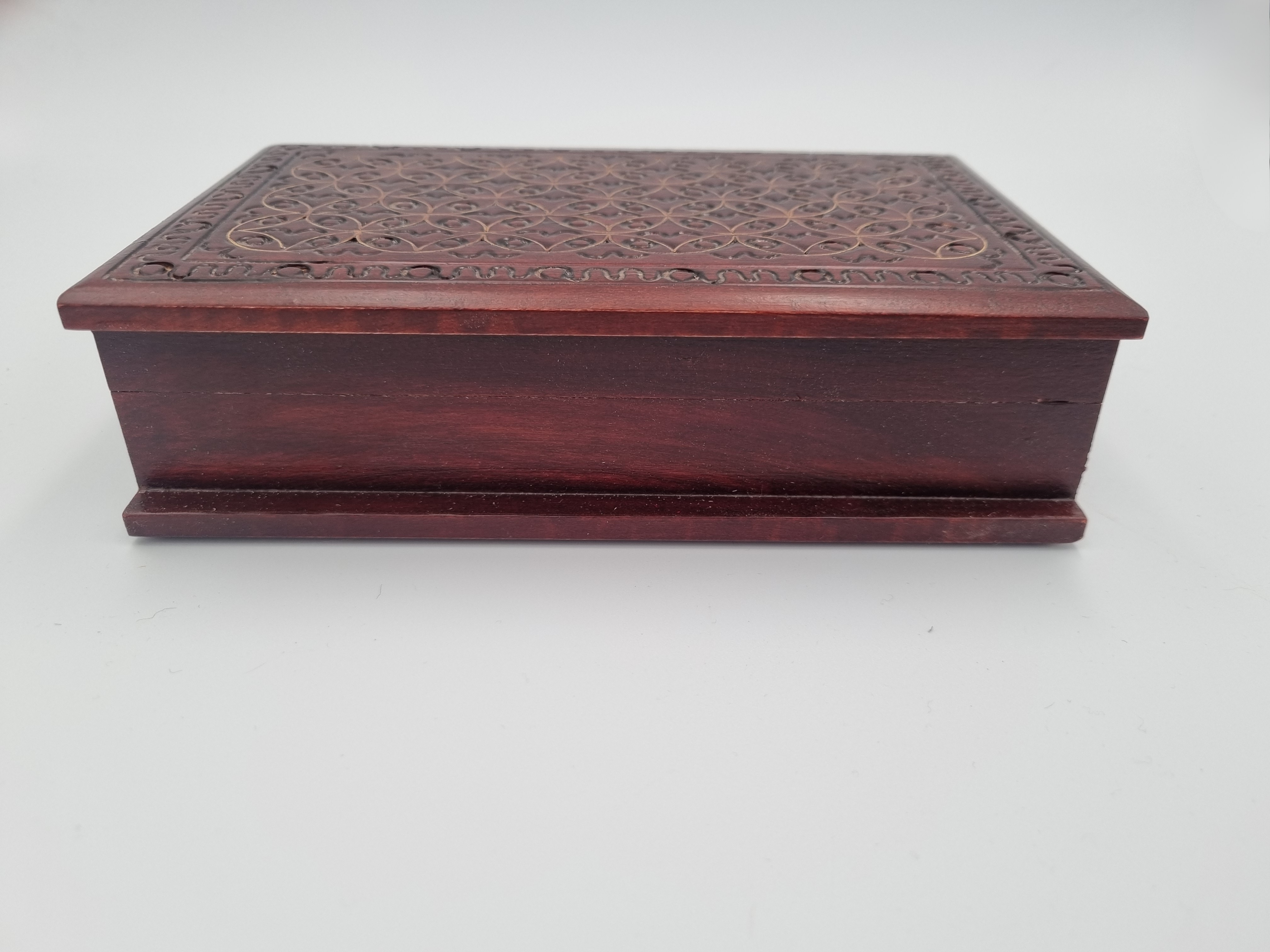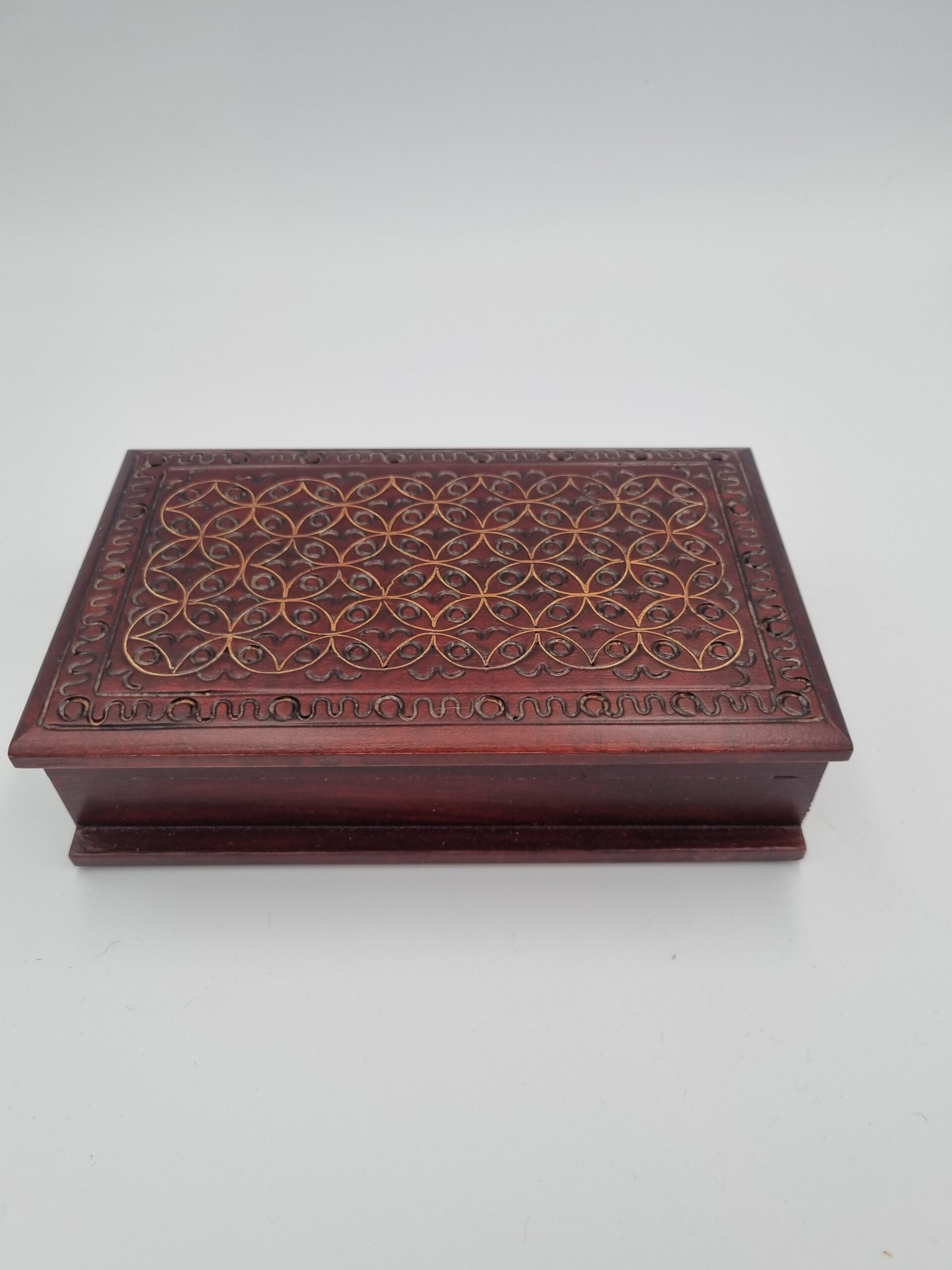 Powierzchnie zdobią starannie wypalane wzory, uzupełnione delikatnymi złotymi akcentami, które subtelnie podkreślają drewno. Każdy detal powstaje z dużą precyzją i cierpliwością, dlatego każda szkatułka ma swój niepowtarzalny charakter.