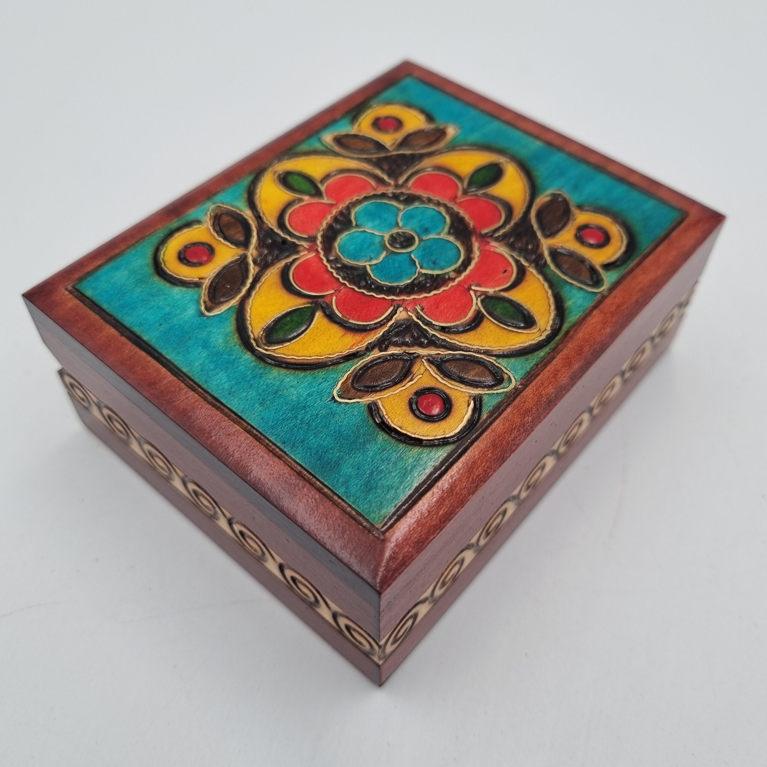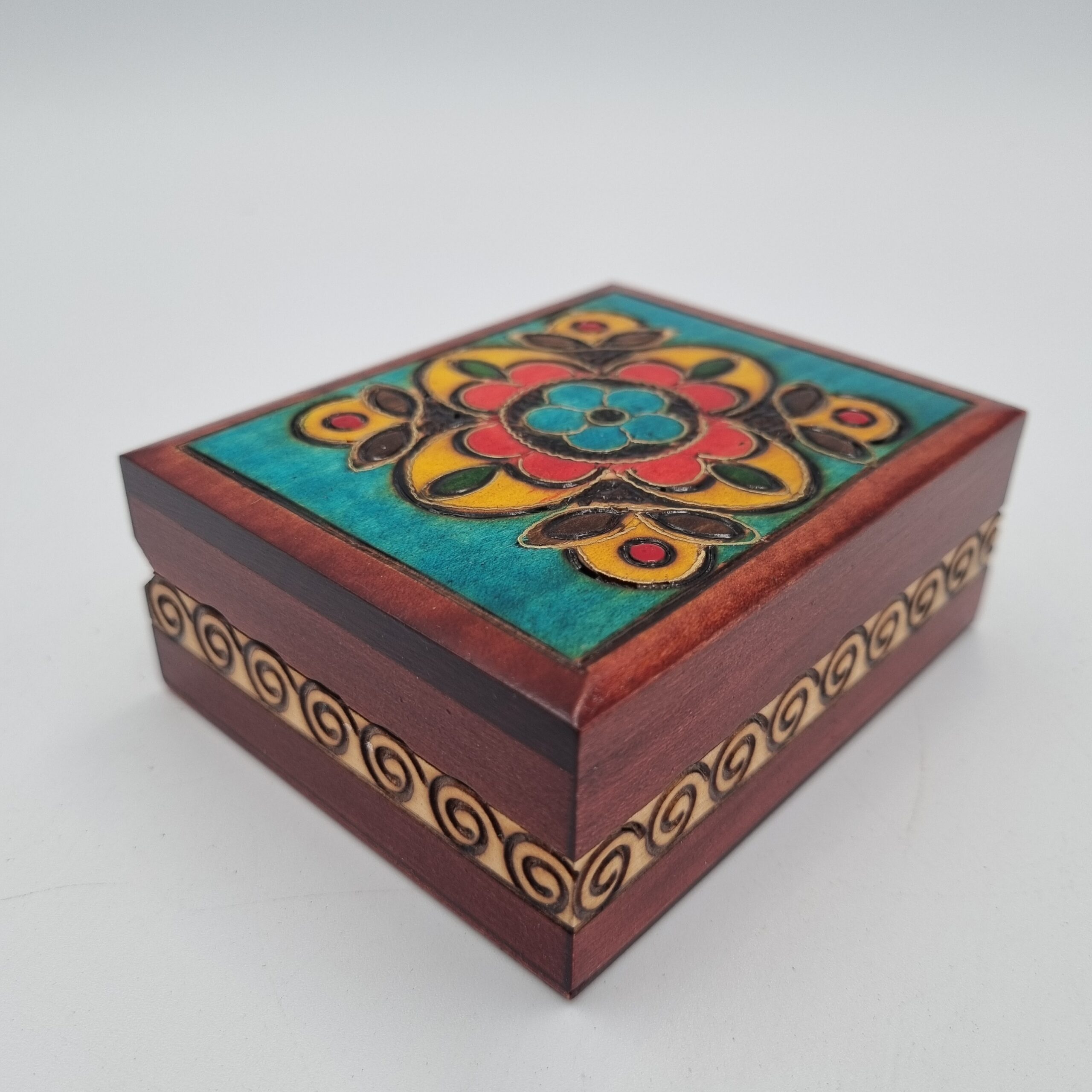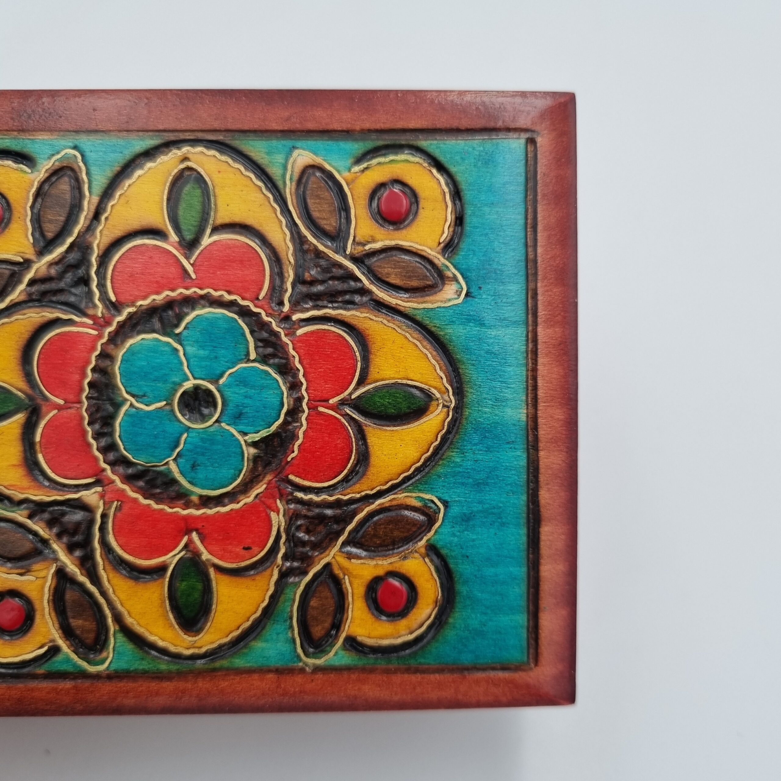 Każdy egzemplarz jest unikatowy – ręcznie wykonany i zdobiony kwiatowymi ornamentami wypalanymi bezpośrednio w drewnie. Delikatne inkrustacje, subtelnie podkreślone złotym kolorem, nadają kasetce elegancji i wyjątkowej głębi.