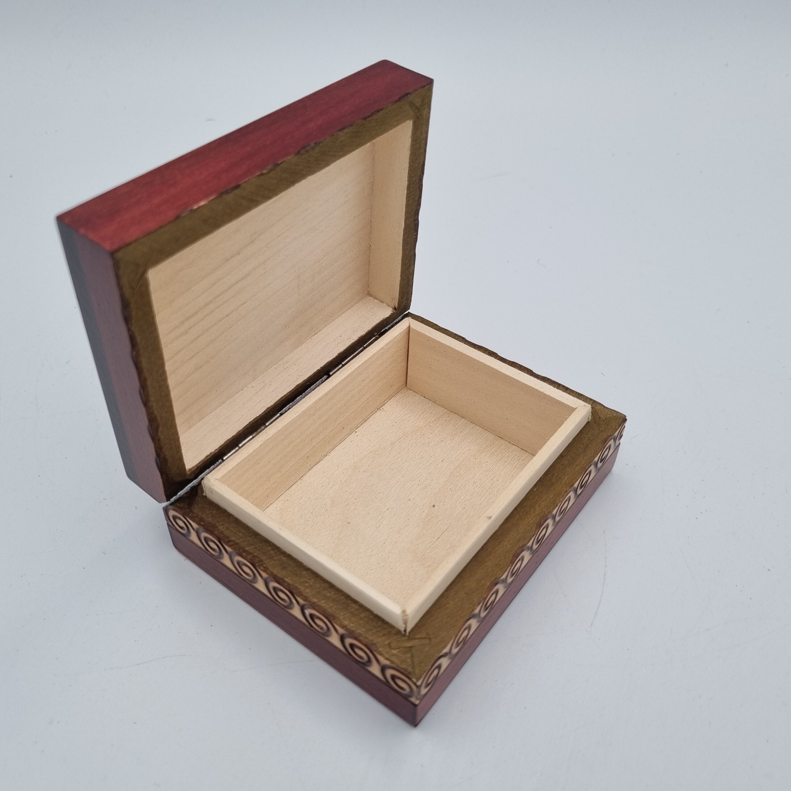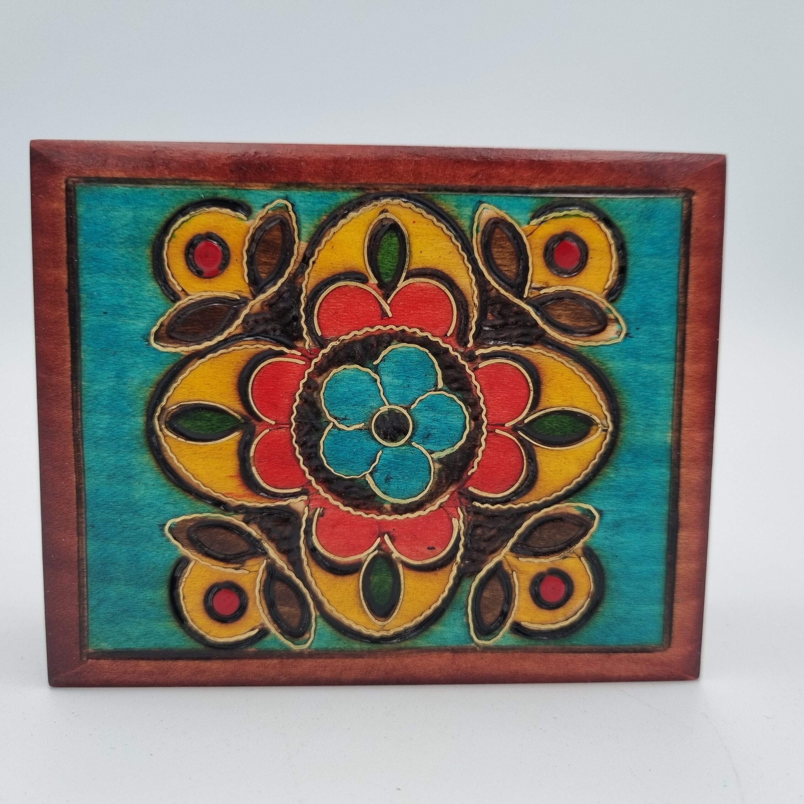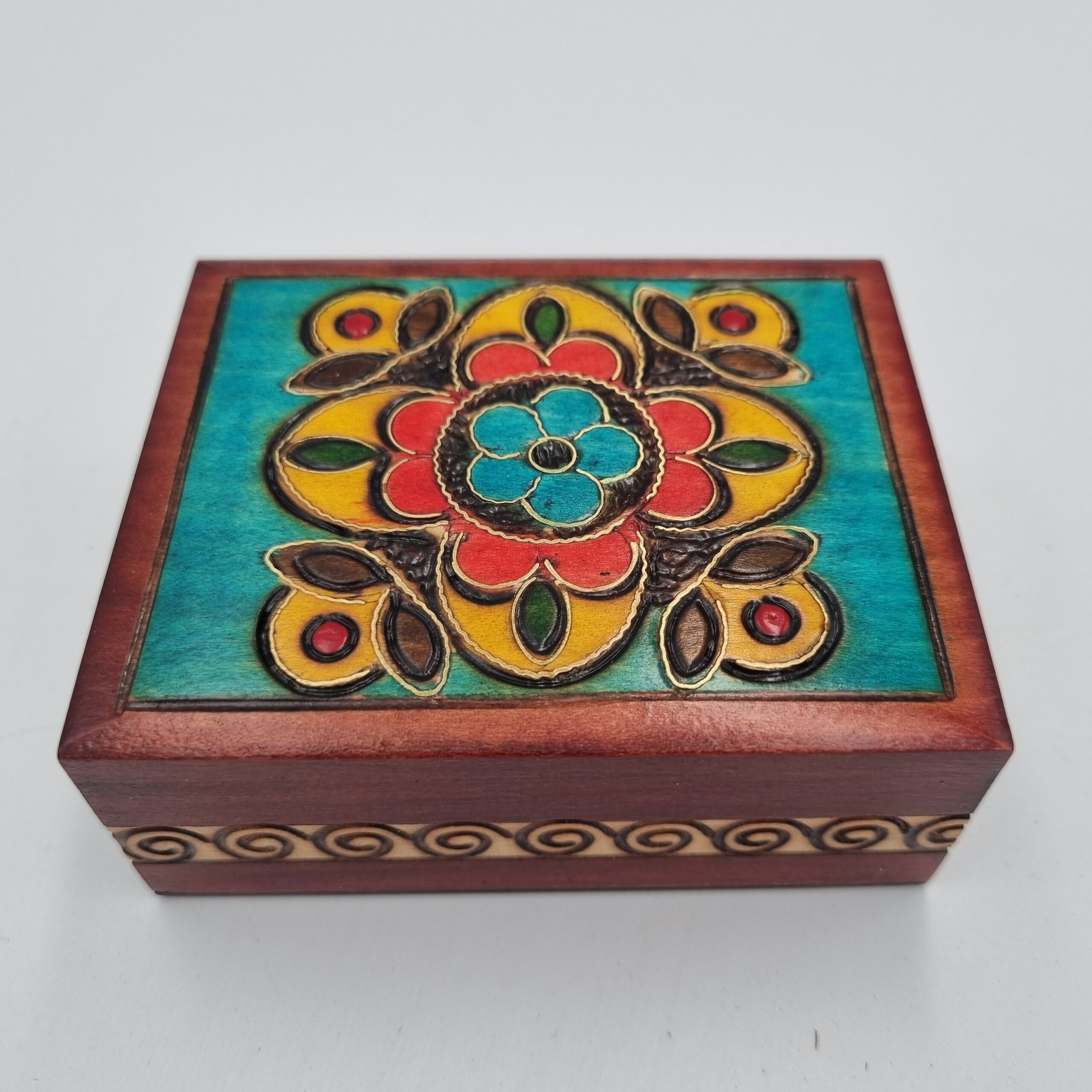 Każdy egzemplarz jest unikatowy – ręcznie wykonany i zdobiony kwiatowymi ornamentami wypalanymi bezpośrednio w drewnie. Delikatne inkrustacje, subtelnie podkreślone złotym kolorem, nadają kasetce elegancji i wyjątkowej głębi.