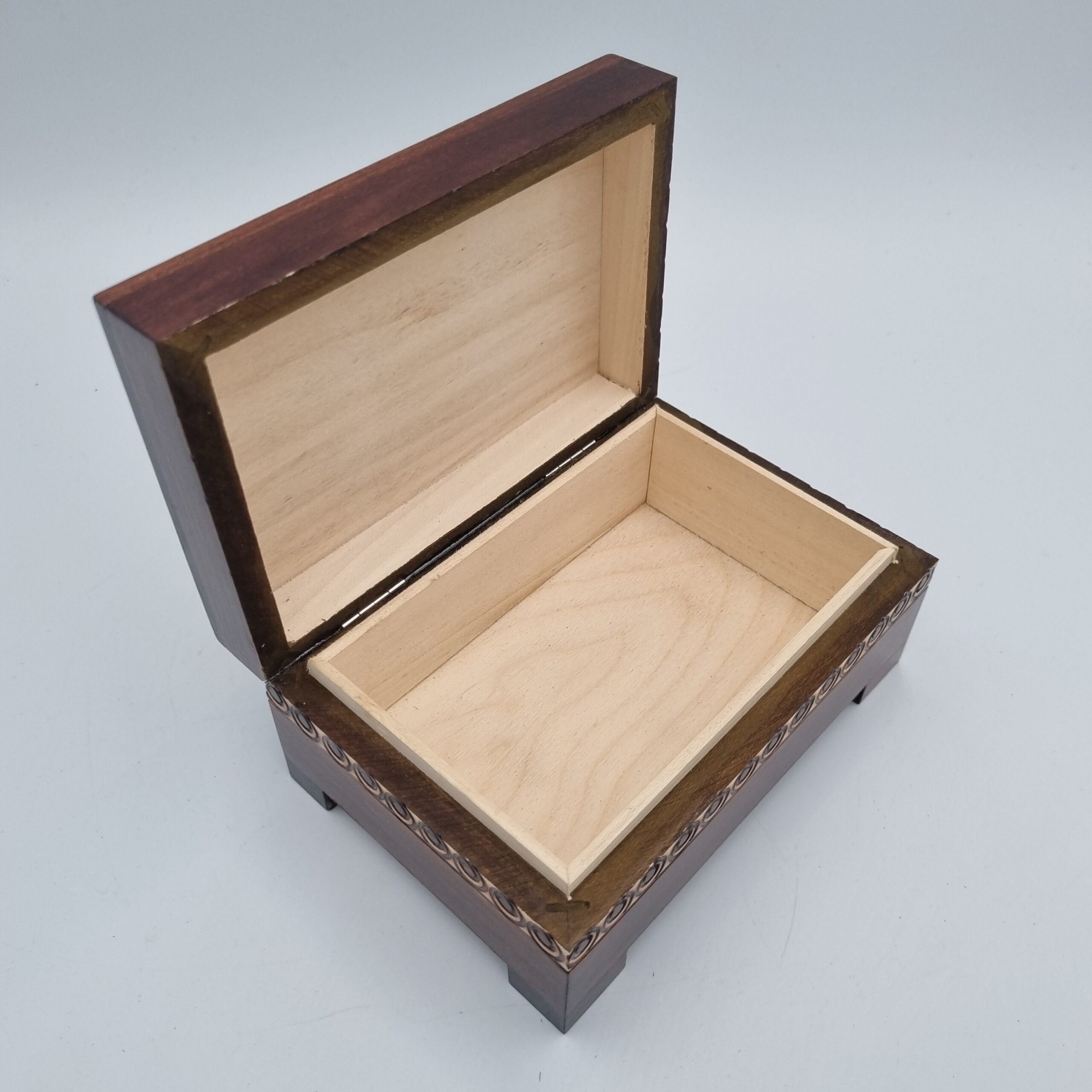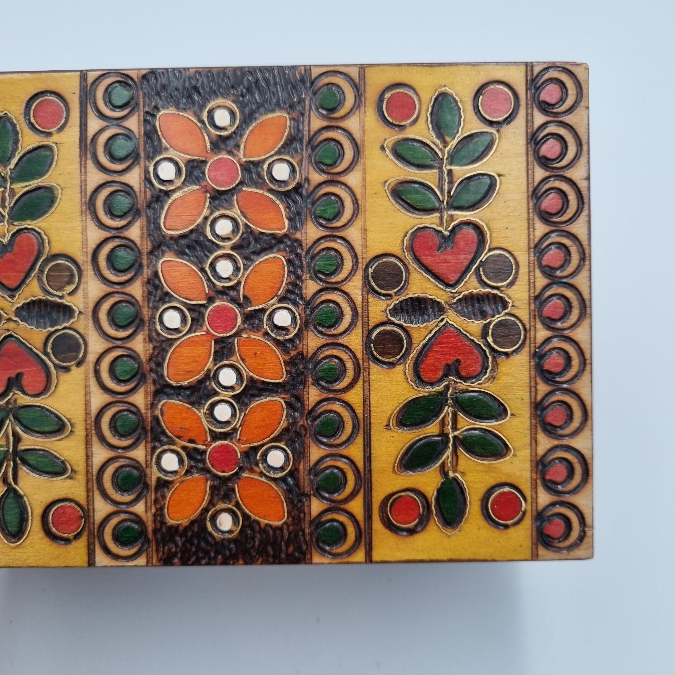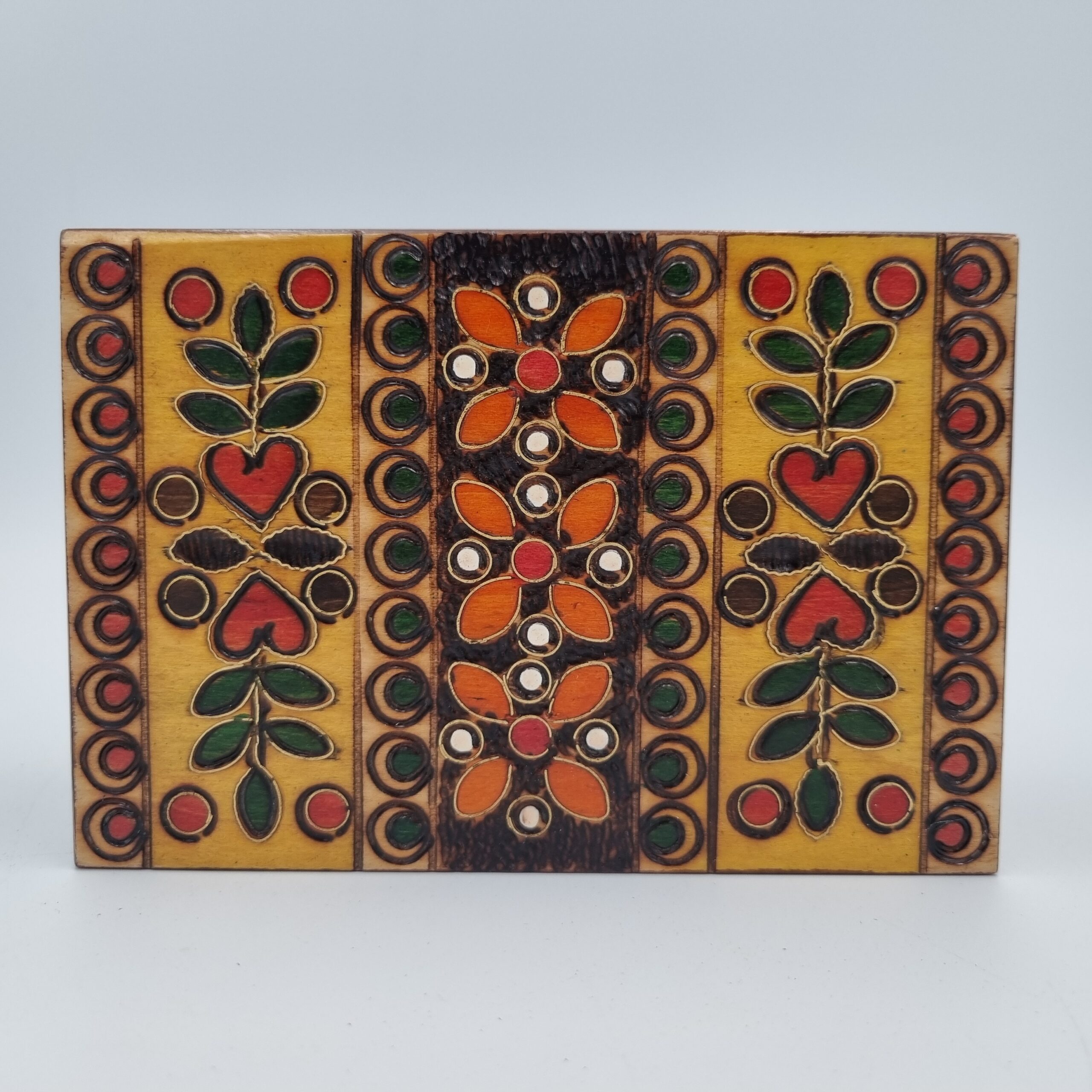 Każdy egzemplarz jest unikatowy – ręcznie wykonany i zdobiony kwiatowymi ornamentami wypalanymi bezpośrednio w drewnie. Delikatne inkrustacje, subtelnie podkreślone złotym kolorem, nadają kasetce elegancji i wyjątkowej głębi.