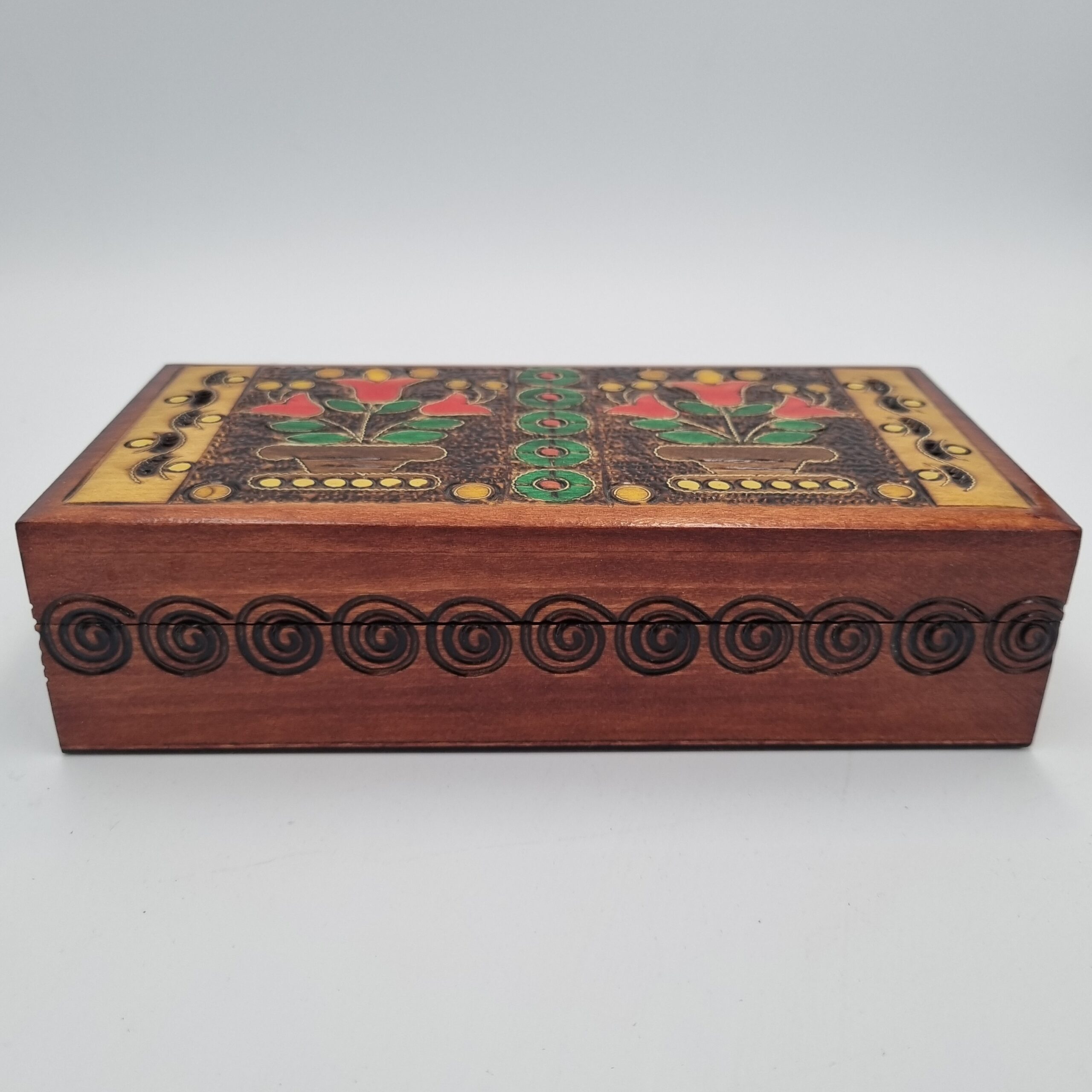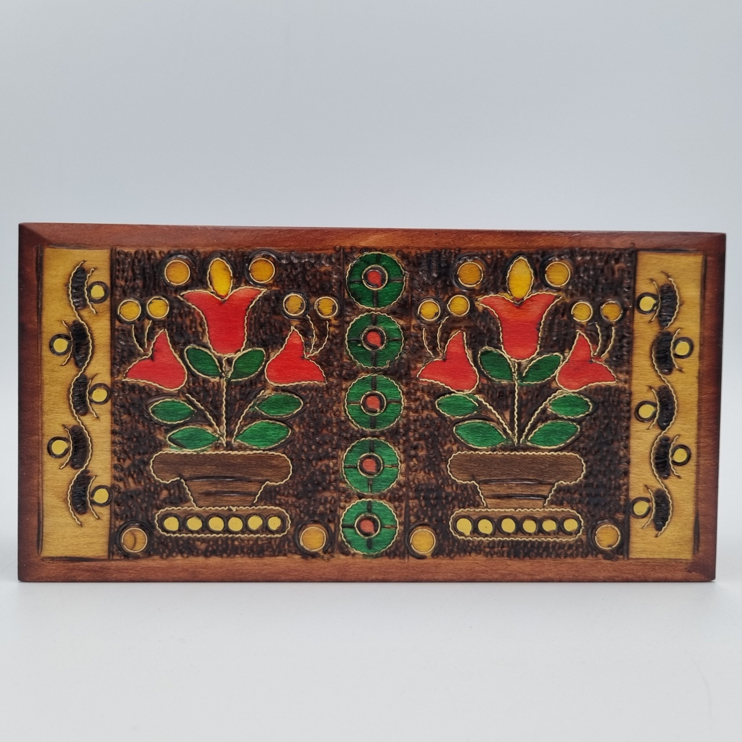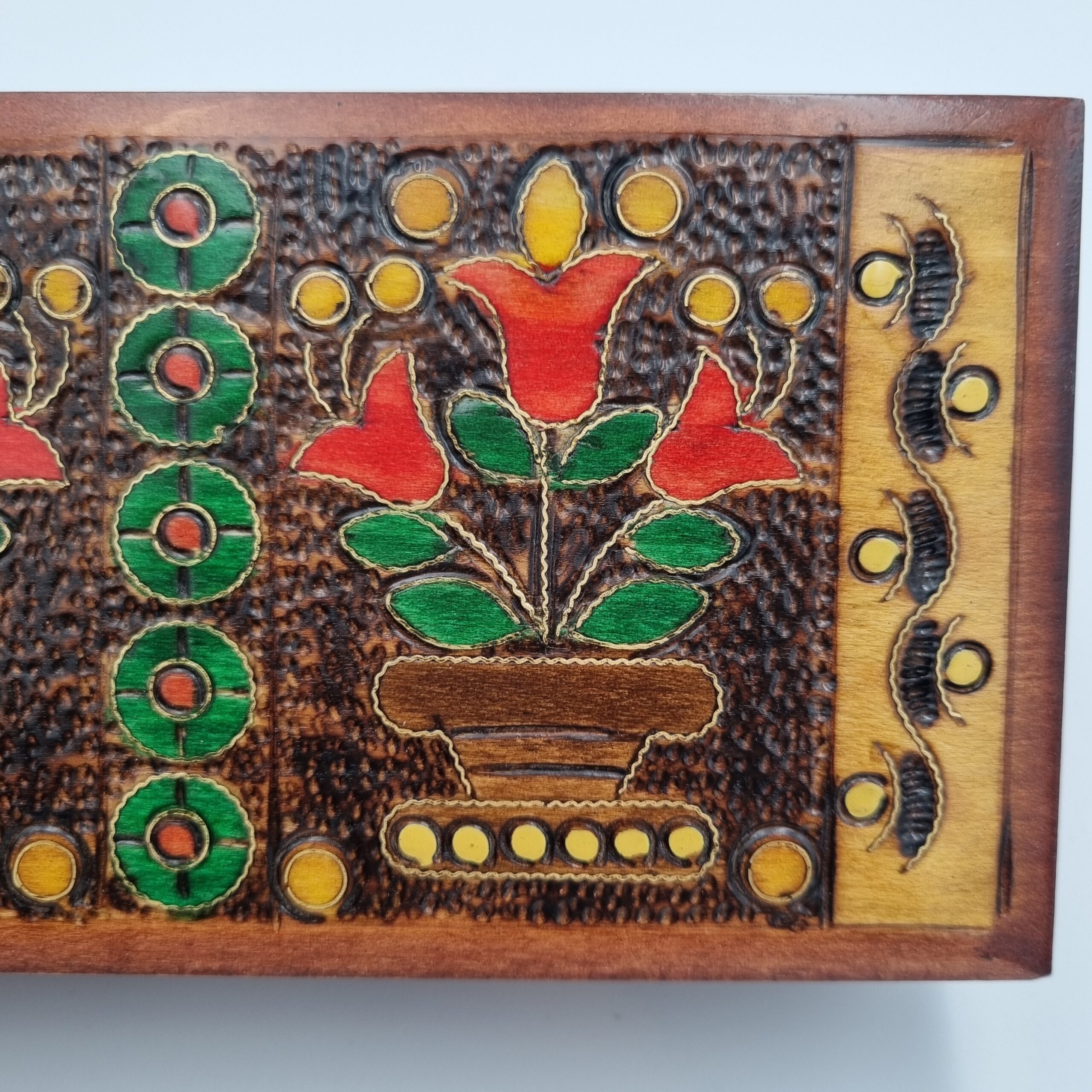 Każdy egzemplarz jest unikatowy – ręcznie wykonany i zdobiony kwiatowymi ornamentami wypalanymi bezpośrednio w drewnie. Delikatne inkrustacje, subtelnie podkreślone złotym kolorem, nadają kasetce elegancji i wyjątkowej głębi.