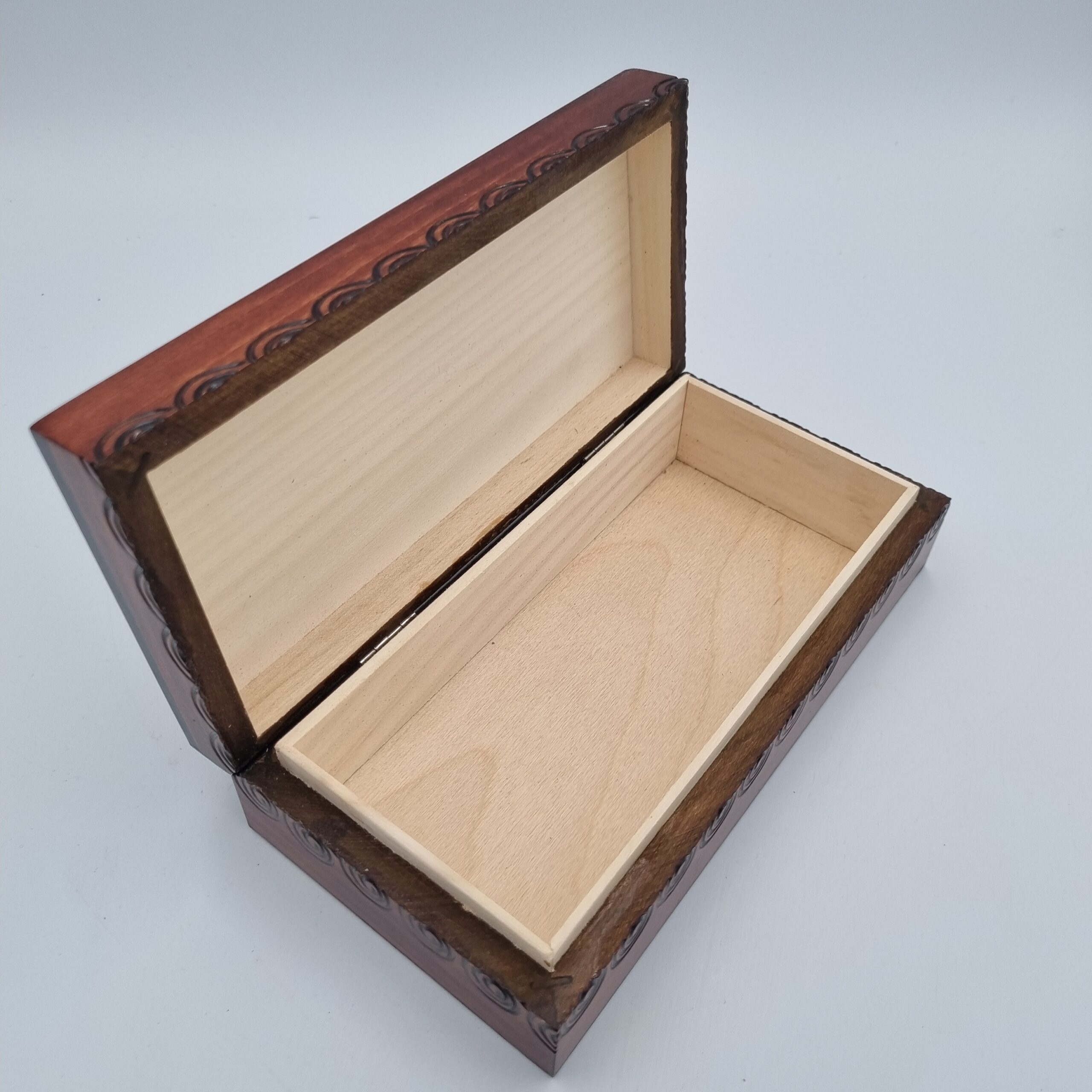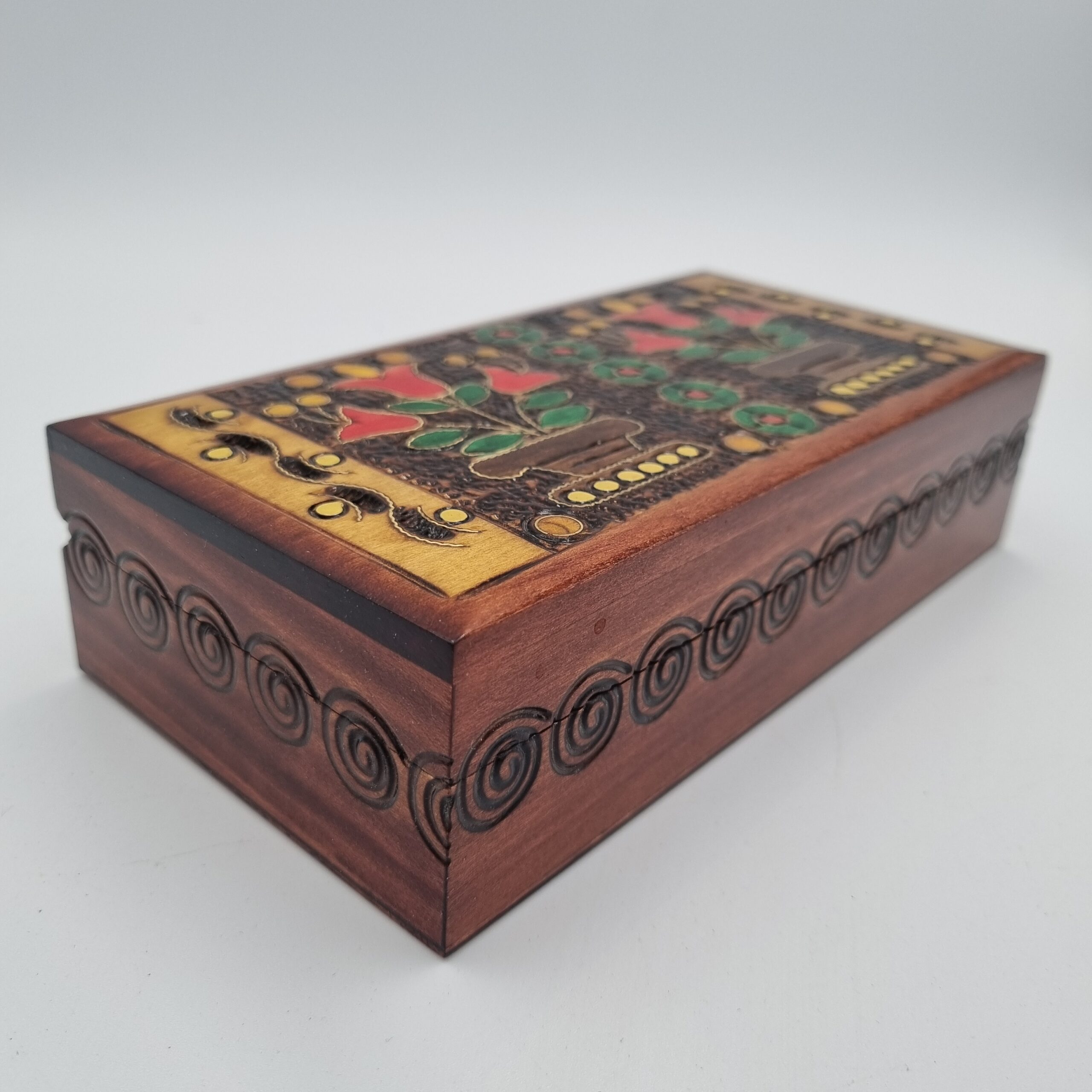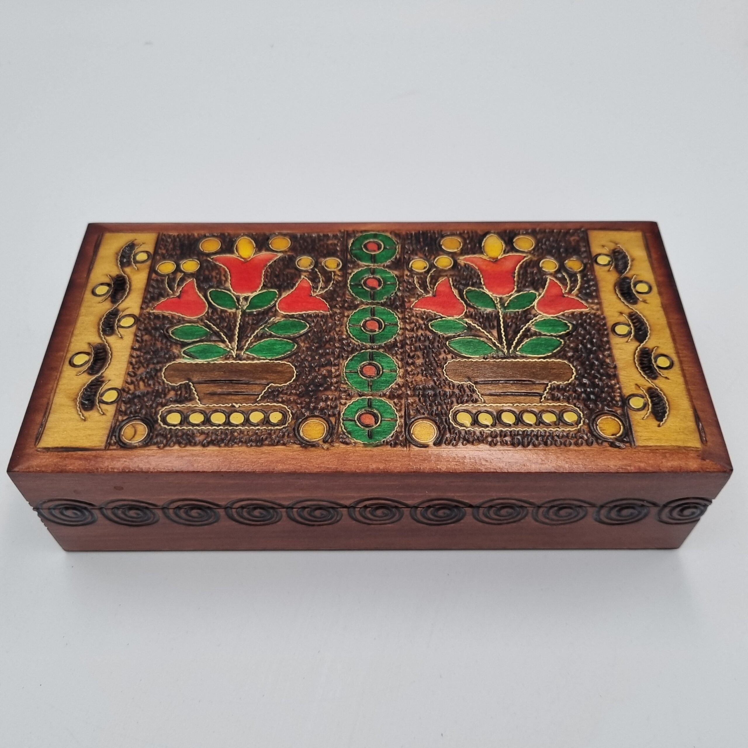 Każdy egzemplarz jest unikatowy – ręcznie wykonany i zdobiony kwiatowymi ornamentami wypalanymi bezpośrednio w drewnie. Delikatne inkrustacje, subtelnie podkreślone złotym kolorem, nadają kasetce elegancji i wyjątkowej głębi.