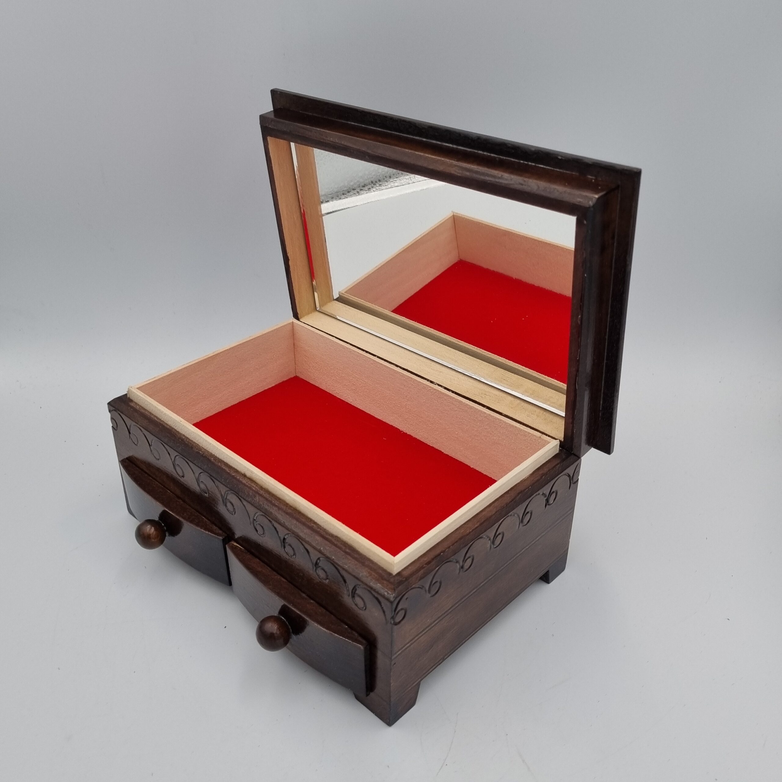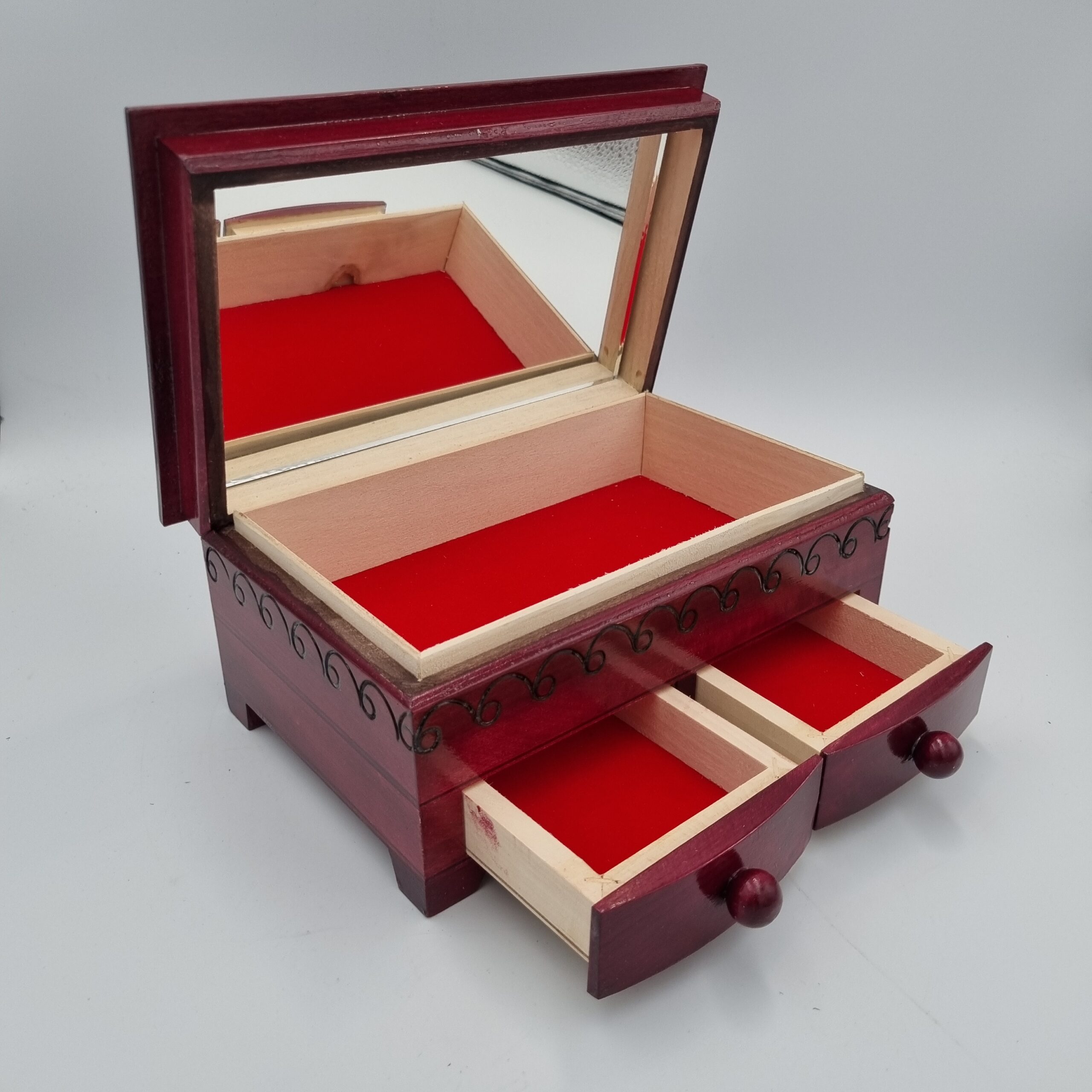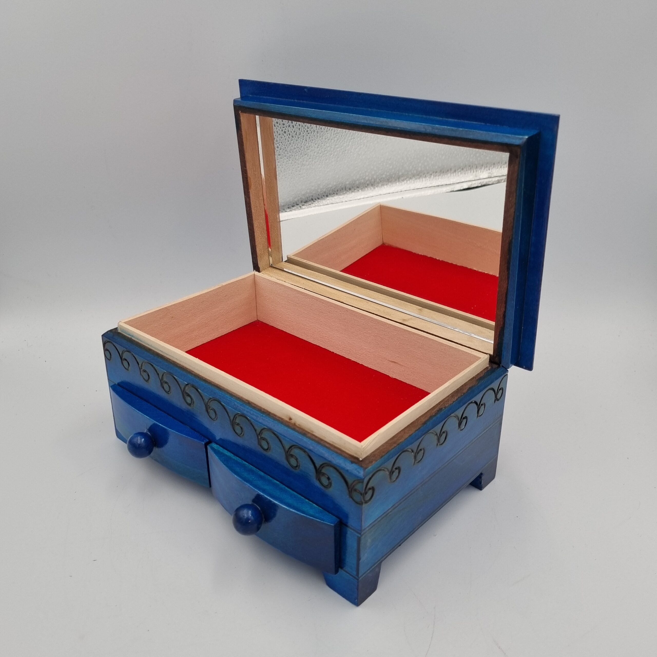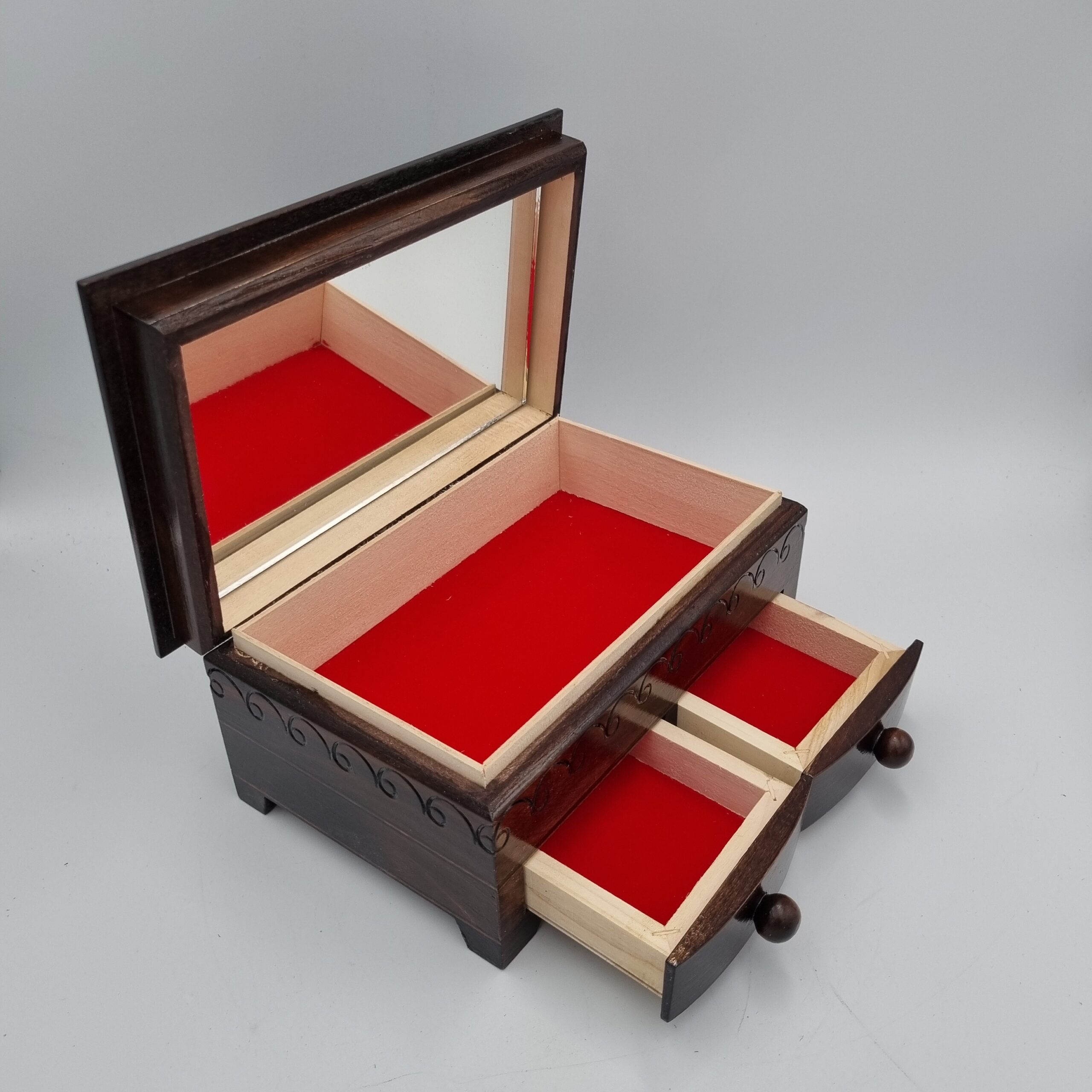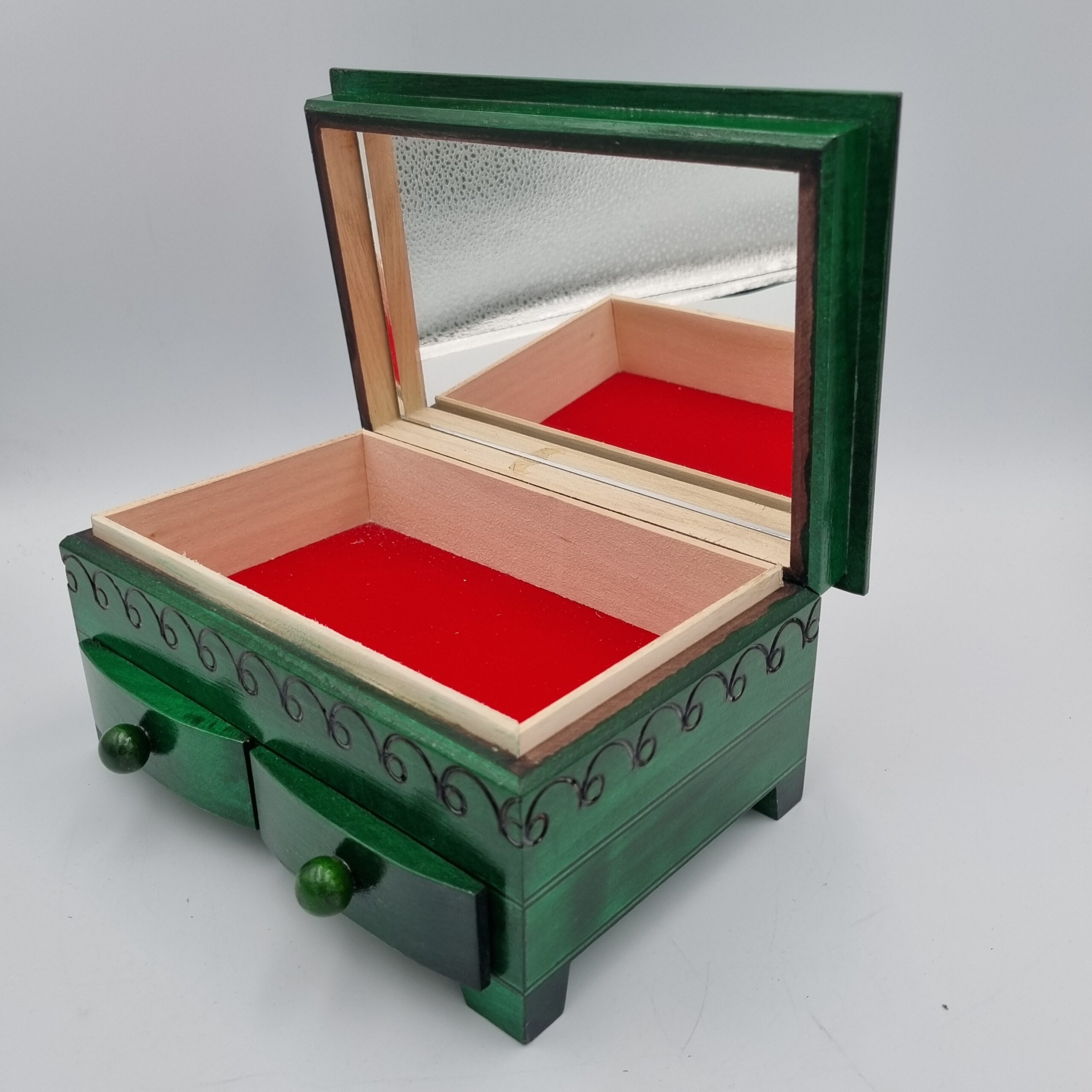 Elegancka szkatułka w formie miniaturowej komody z lustrem to stylowy i funkcjonalny prz. Każdy egzemplarz zdobiony jest starannie wypalanymi w drewnie wzorami, które nadają mu wyjątkowego, dekoracyjnego charakteru. Całość pokryto lakierem o wysokim połysku, podkreślającym naturalne piękno drewna i nadającym powierzchni eleganckie wykończenie.