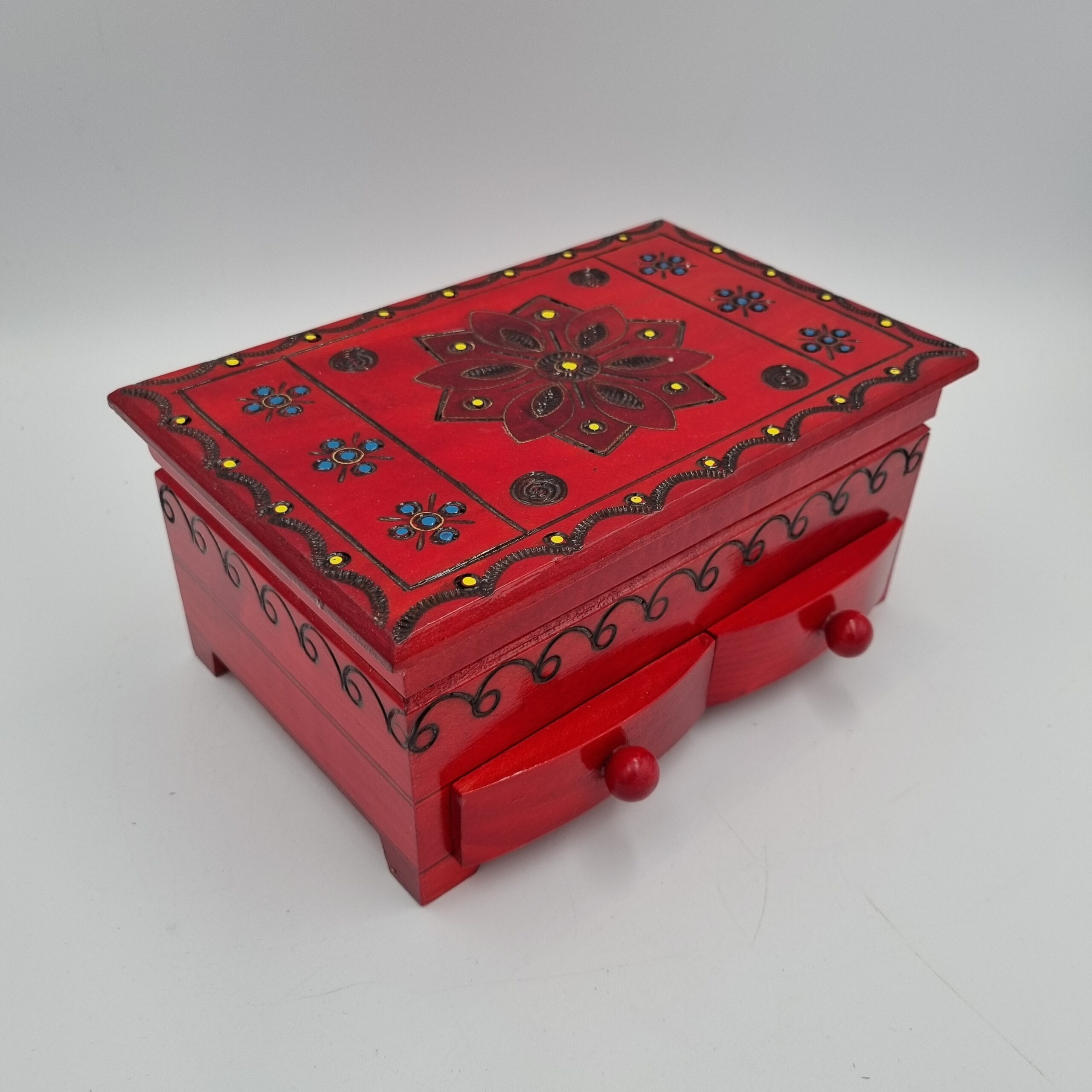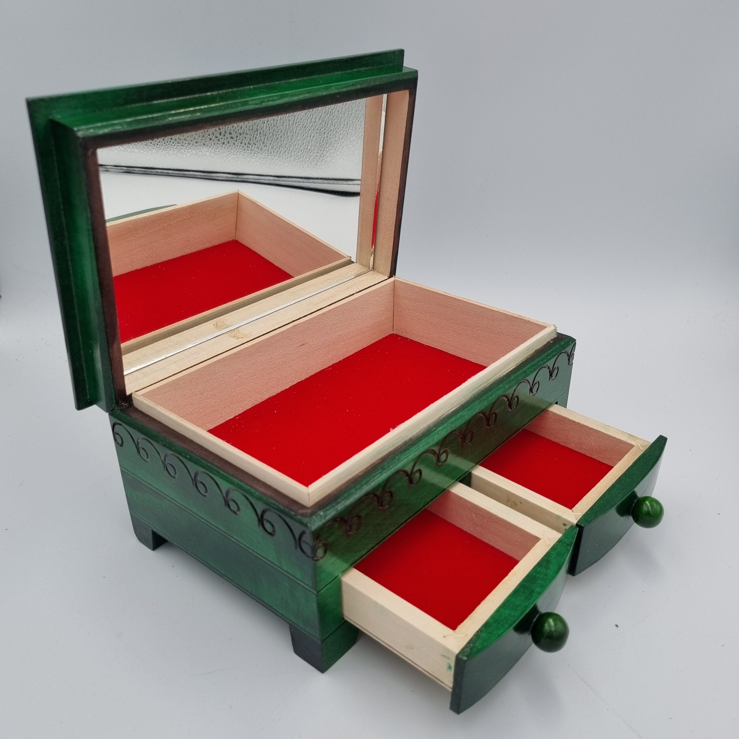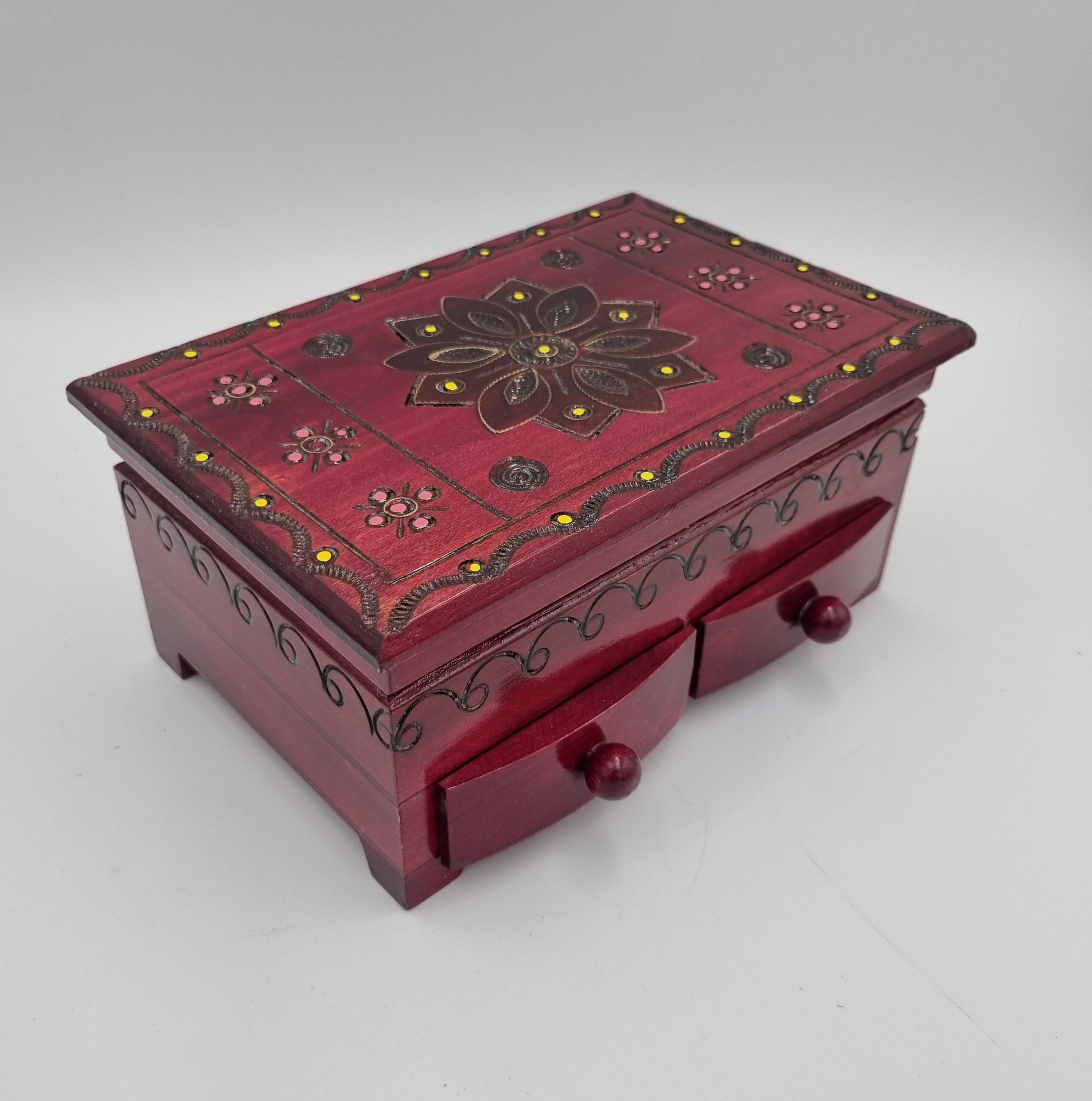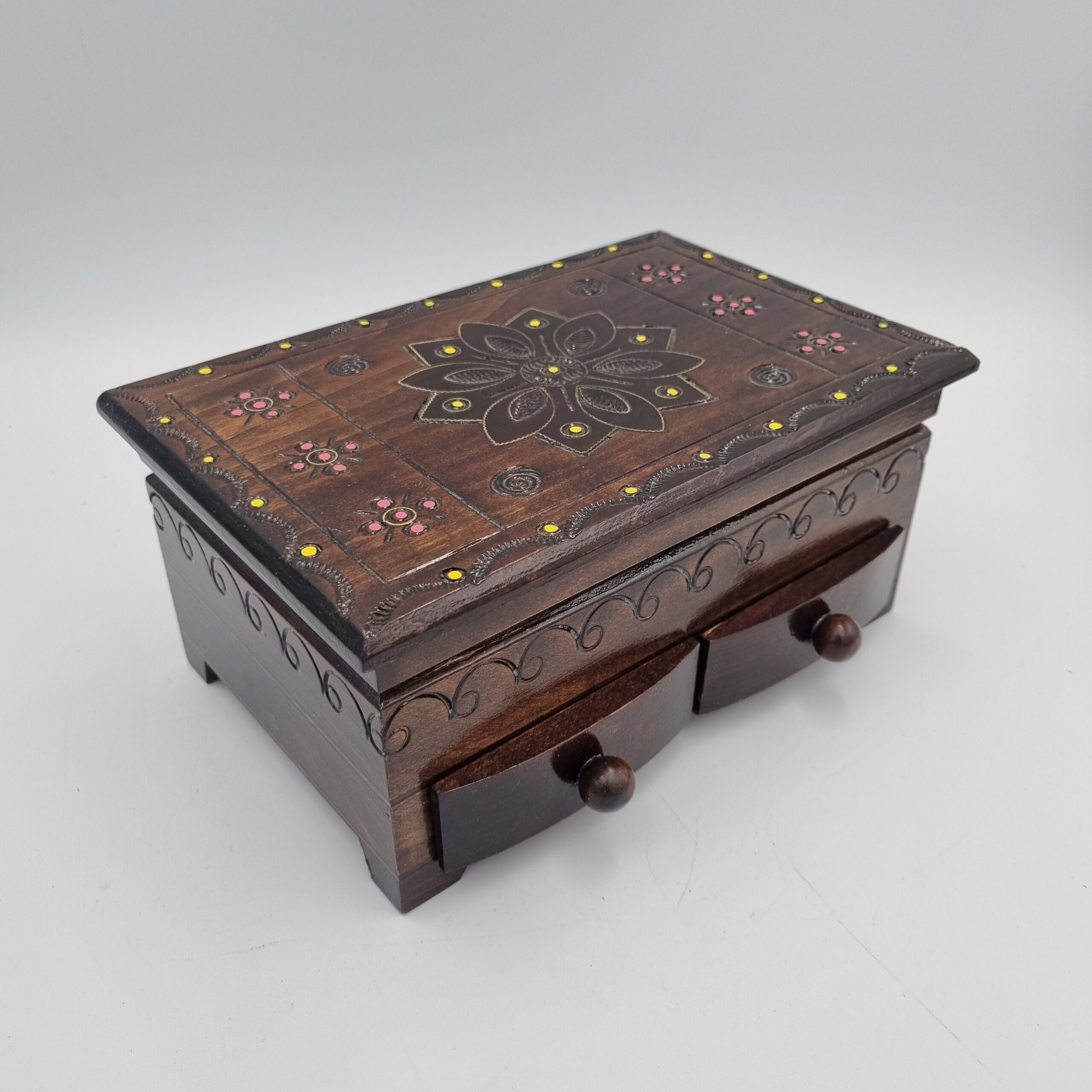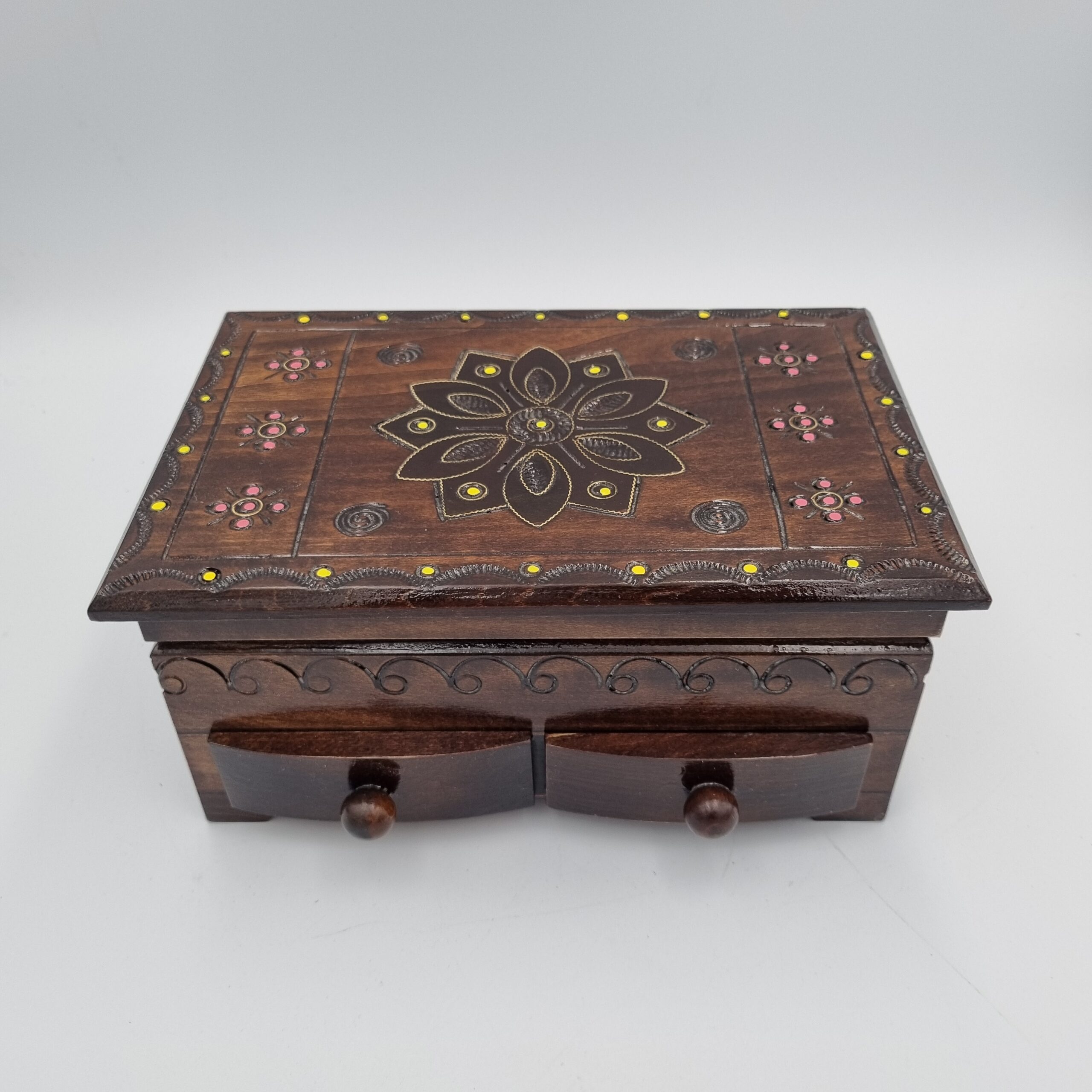 Elegancka szkatułka w formie miniaturowej komody z lustrem to stylowy i funkcjonalny prz. Każdy egzemplarz zdobiony jest starannie wypalanymi w drewnie wzorami, które nadają mu wyjątkowego, dekoracyjnego charakteru. Całość pokryto lakierem o wysokim połysku, podkreślającym naturalne piękno drewna i nadającym powierzchni eleganckie wykończenie.