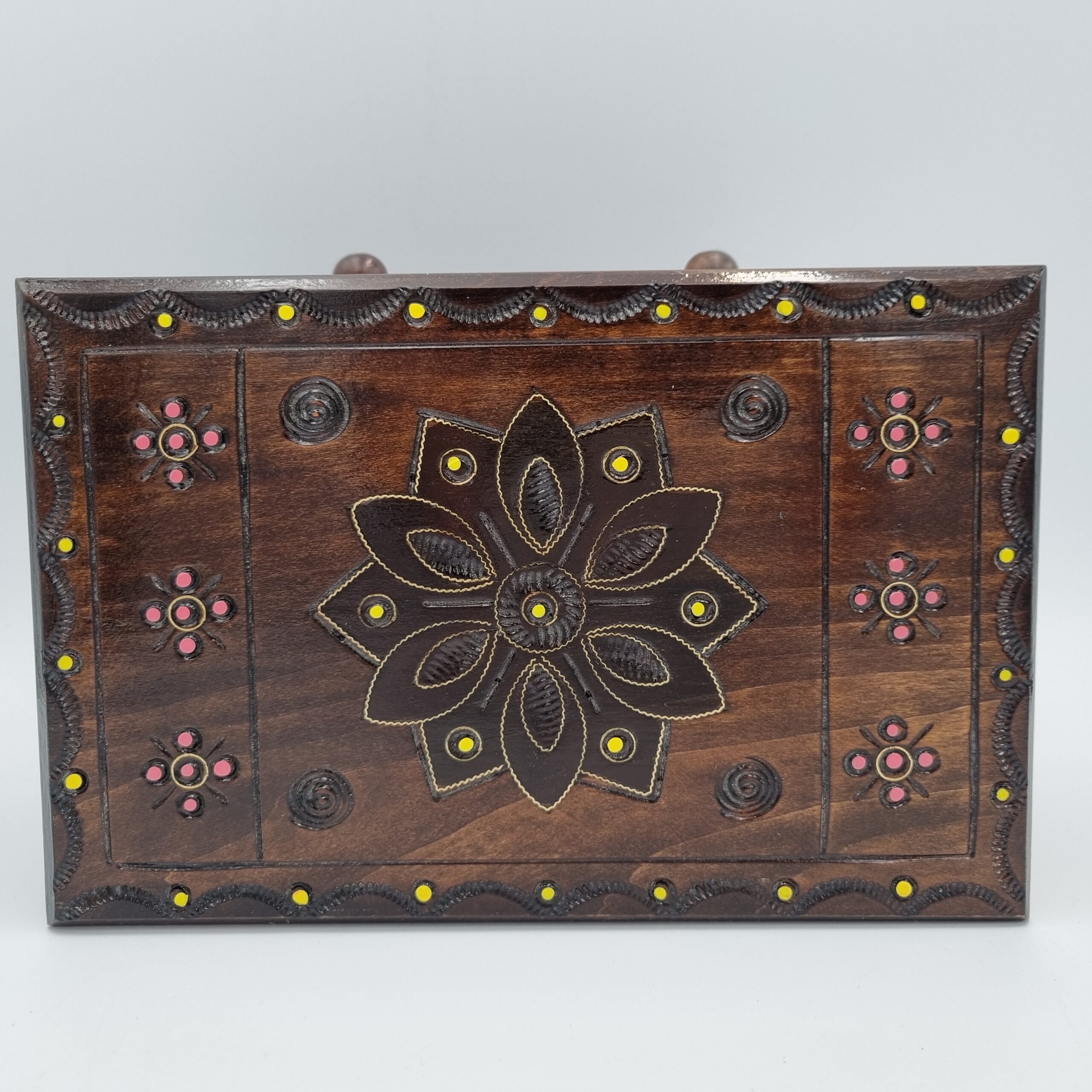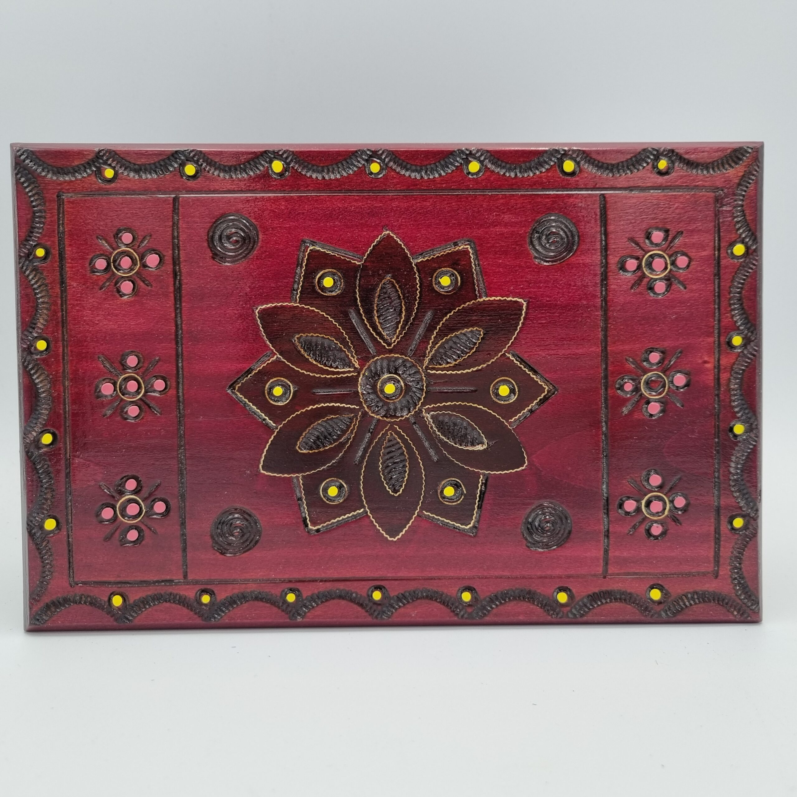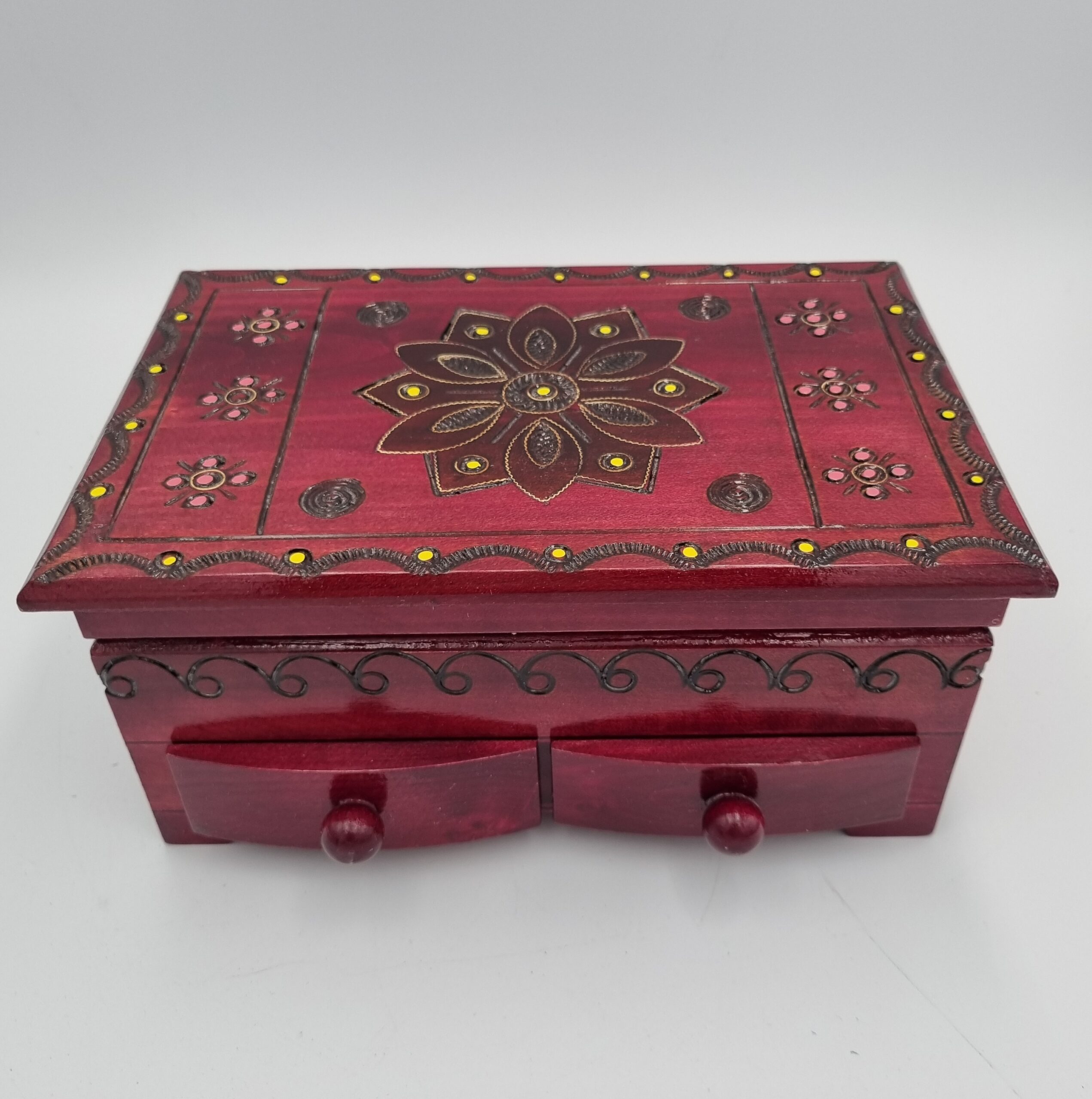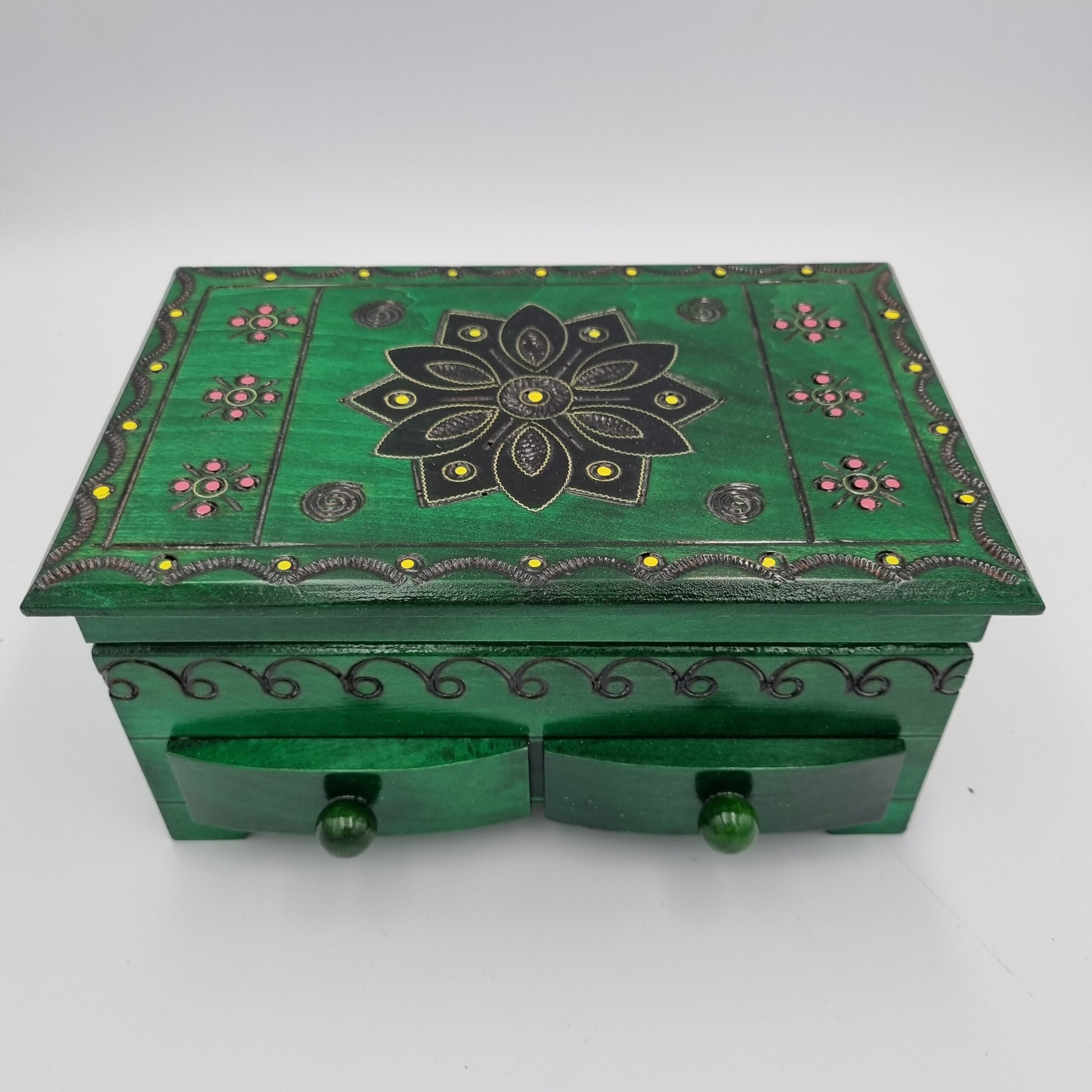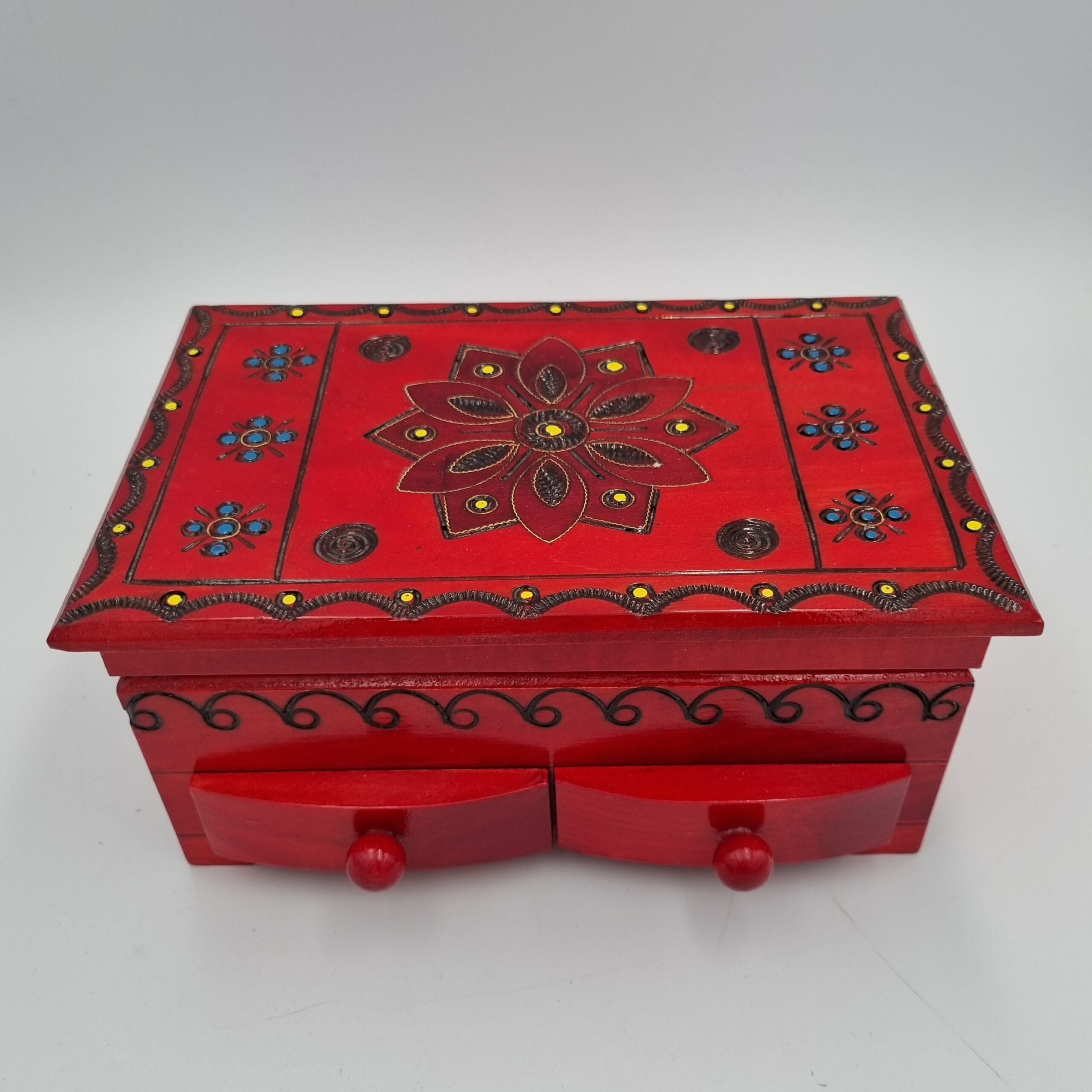 Elegancka szkatułka w formie miniaturowej komody z lustrem to stylowy i funkcjonalny prz. Każdy egzemplarz zdobiony jest starannie wypalanymi w drewnie wzorami, które nadają mu wyjątkowego, dekoracyjnego charakteru. Całość pokryto lakierem o wysokim połysku, podkreślającym naturalne piękno drewna i nadającym powierzchni eleganckie wykończenie.