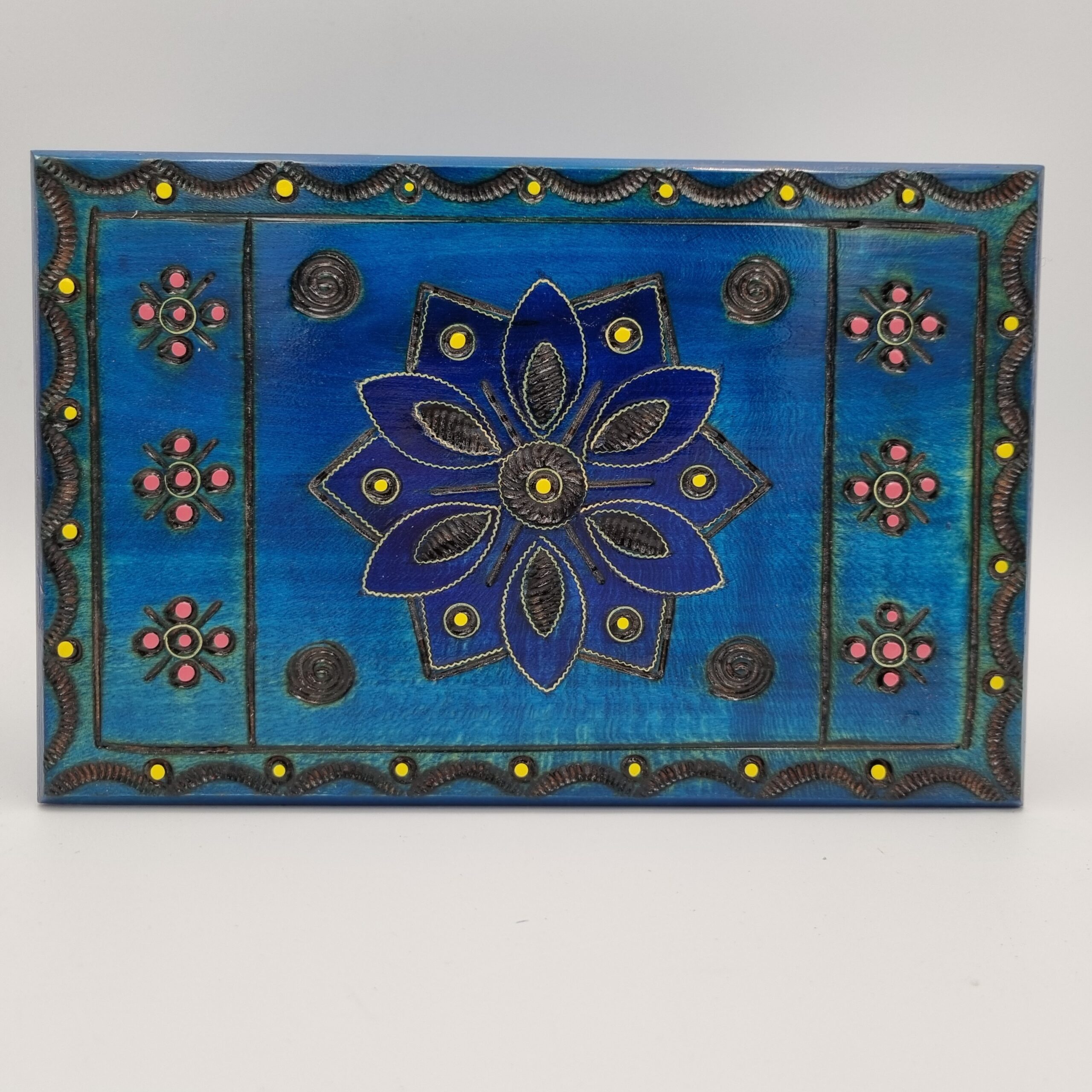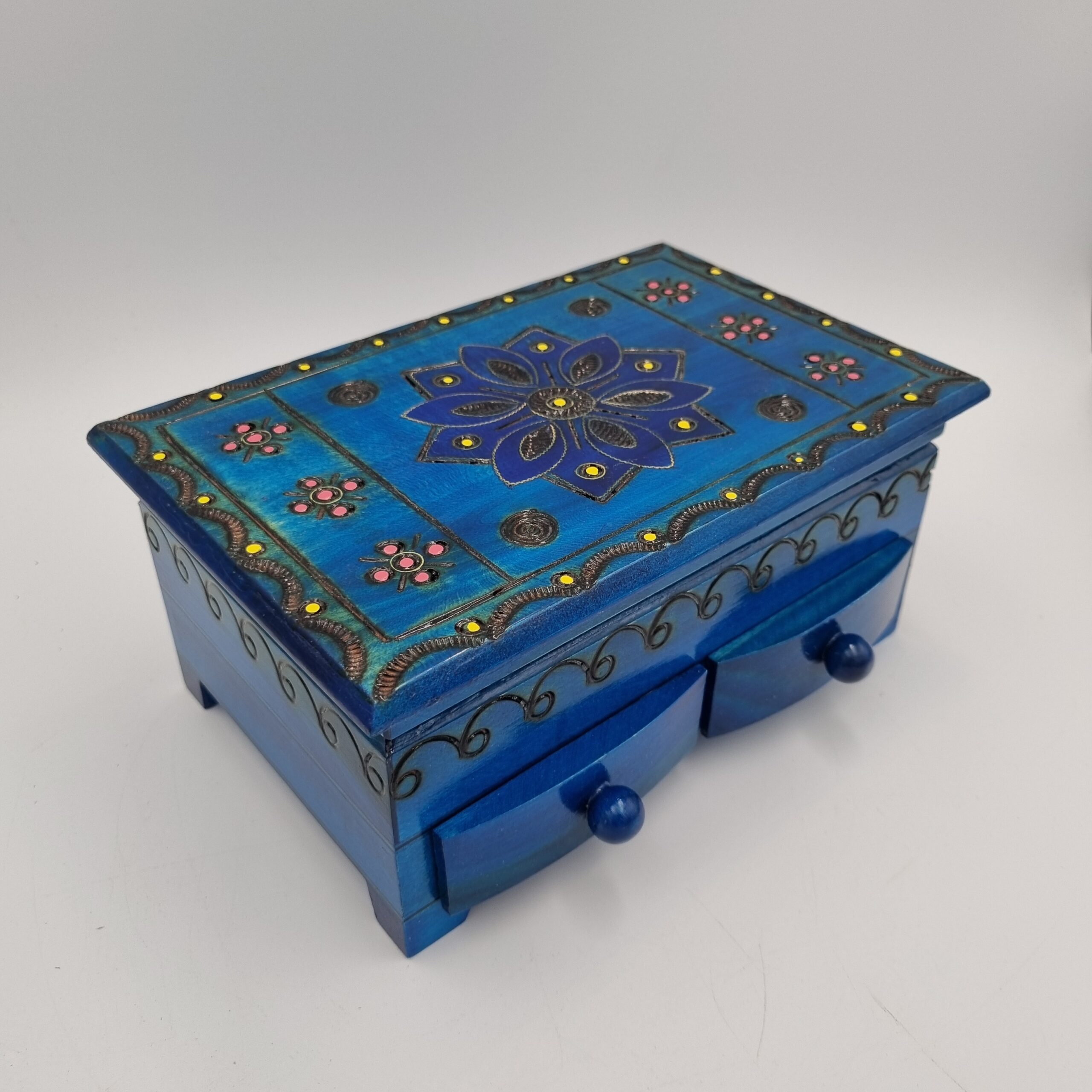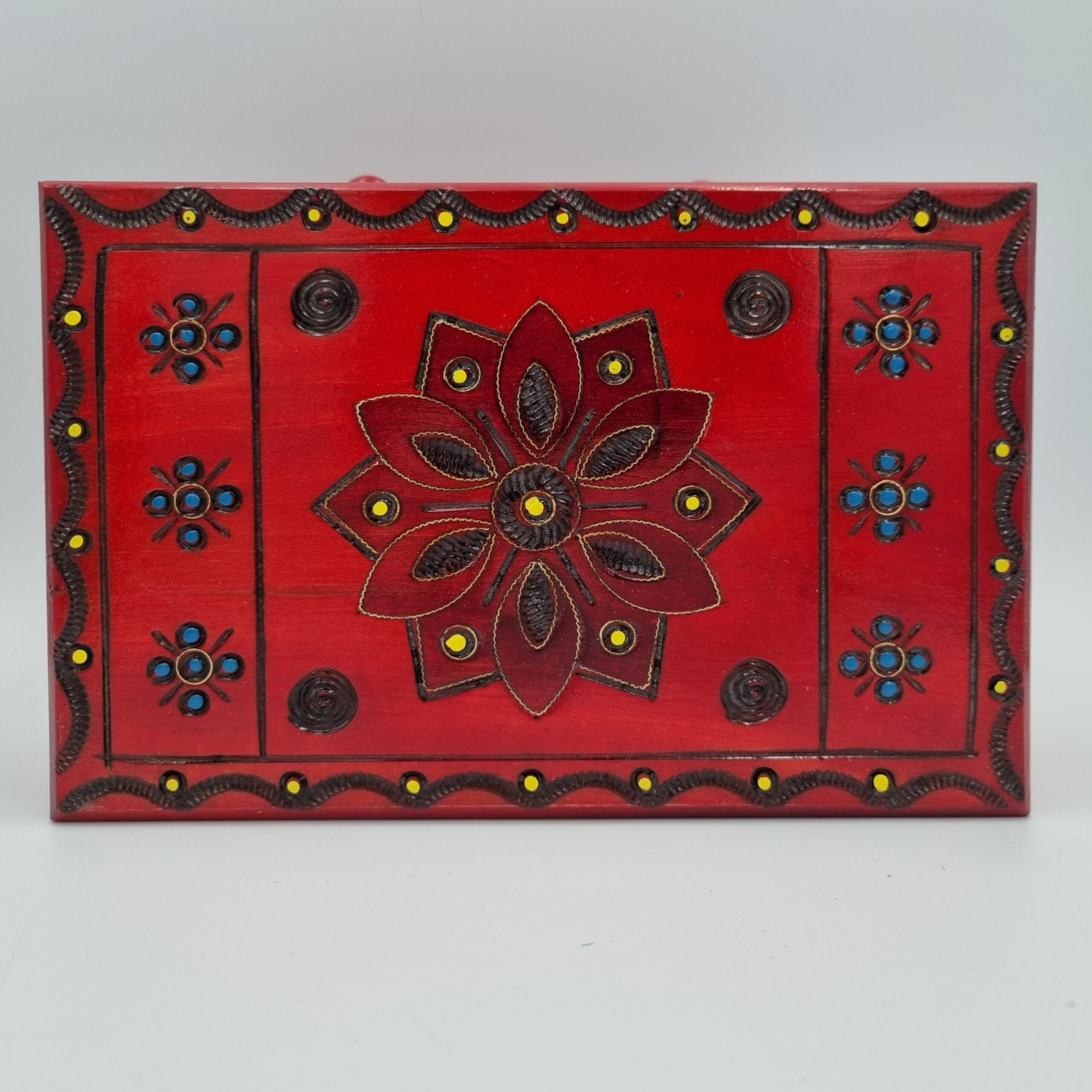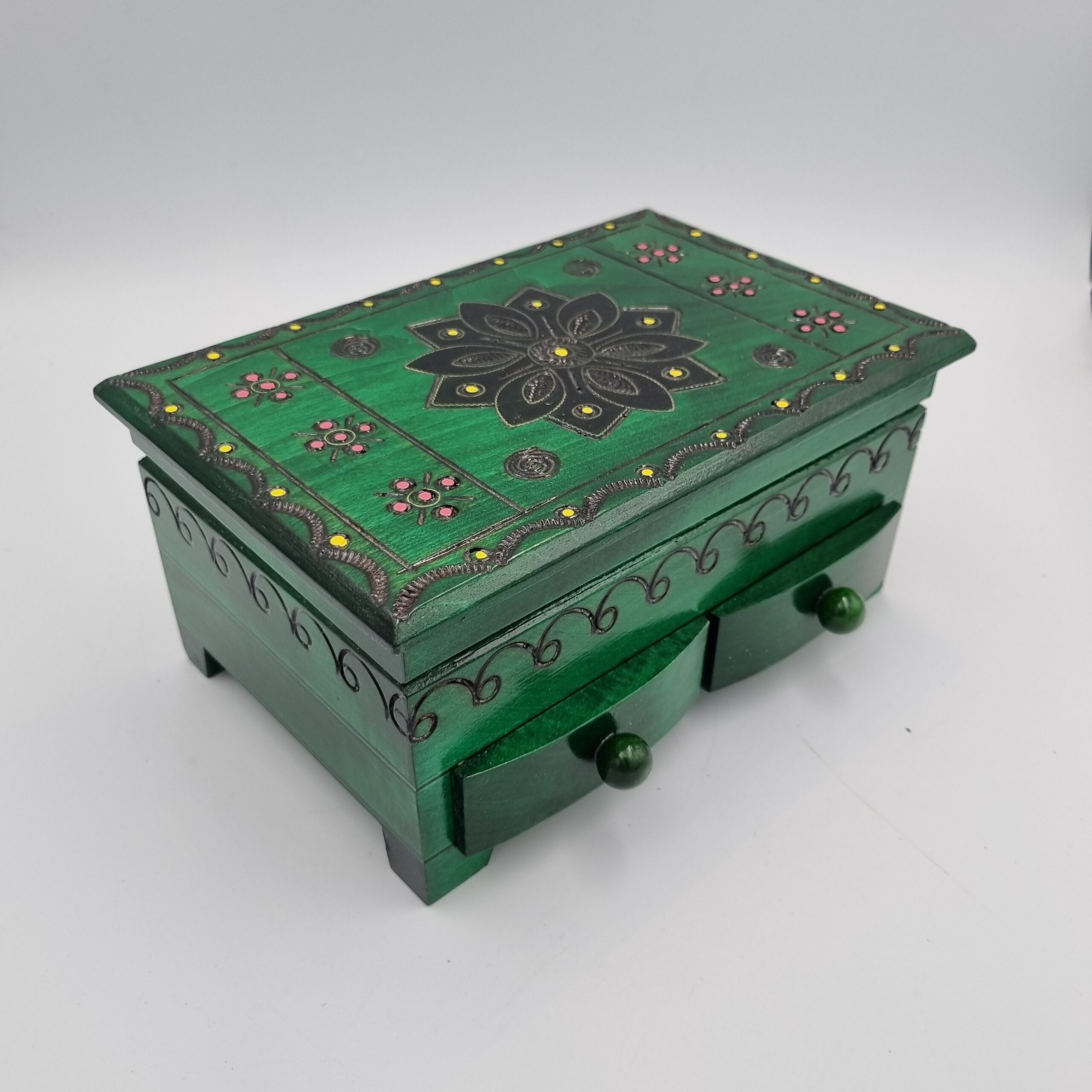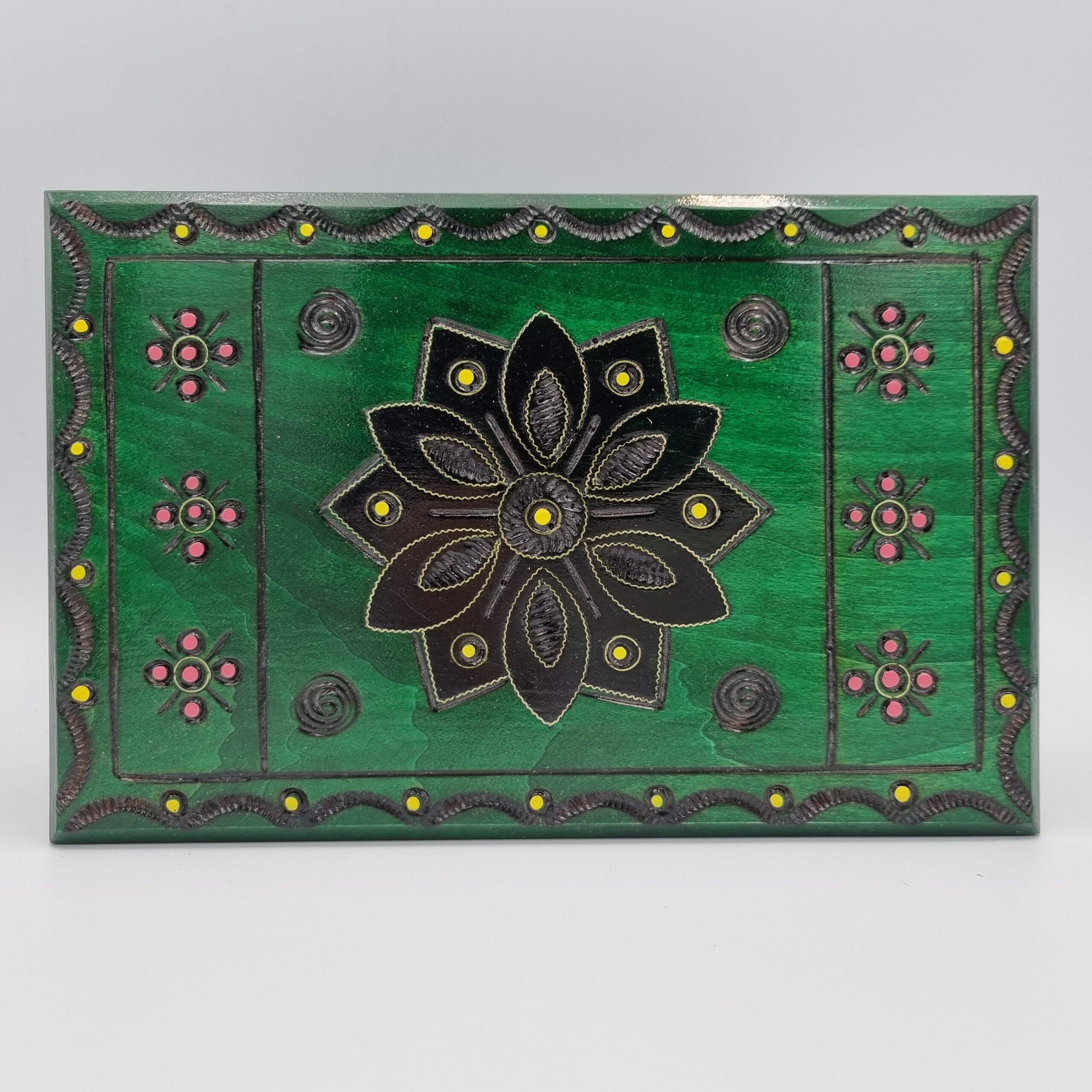 Elegancka szkatułka w formie miniaturowej komody z lustrem to stylowy i funkcjonalny prz. Każdy egzemplarz zdobiony jest starannie wypalanymi w drewnie wzorami, które nadają mu wyjątkowego, dekoracyjnego charakteru. Całość pokryto lakierem o wysokim połysku, podkreślającym naturalne piękno drewna i nadającym powierzchni eleganckie wykończenie.