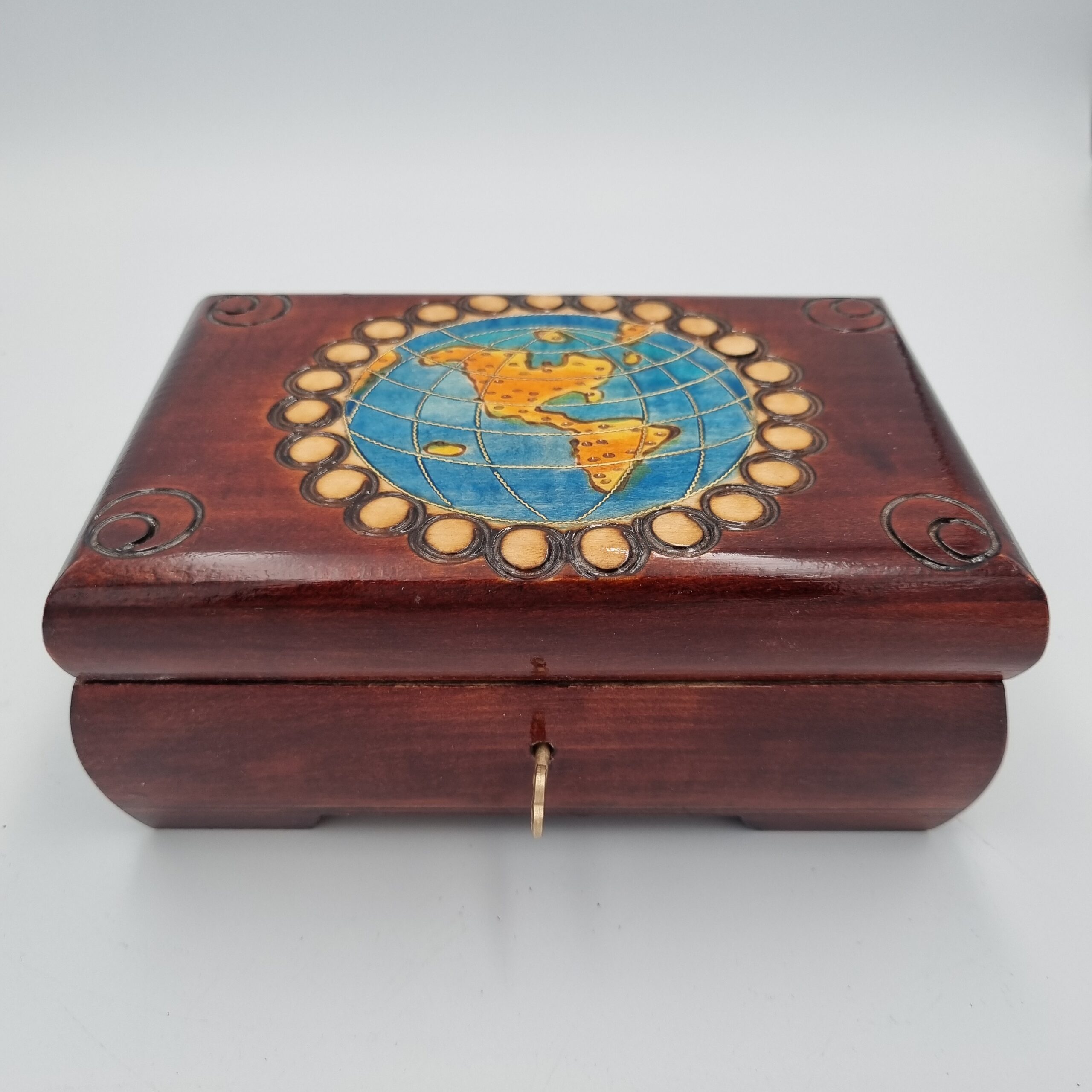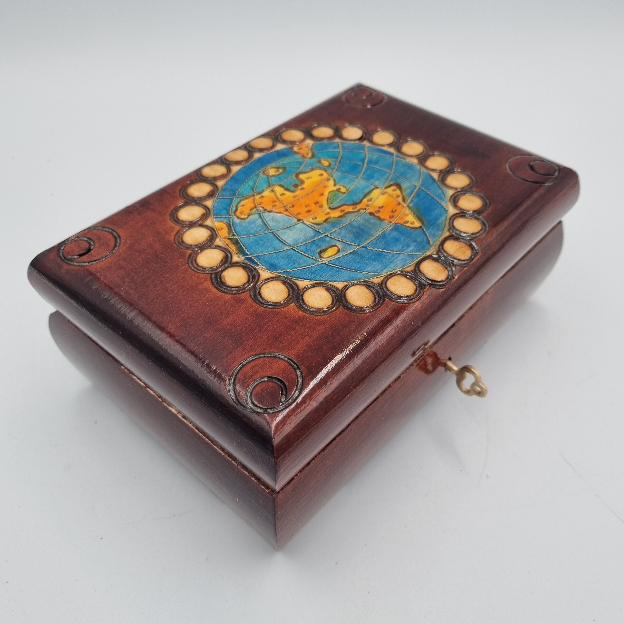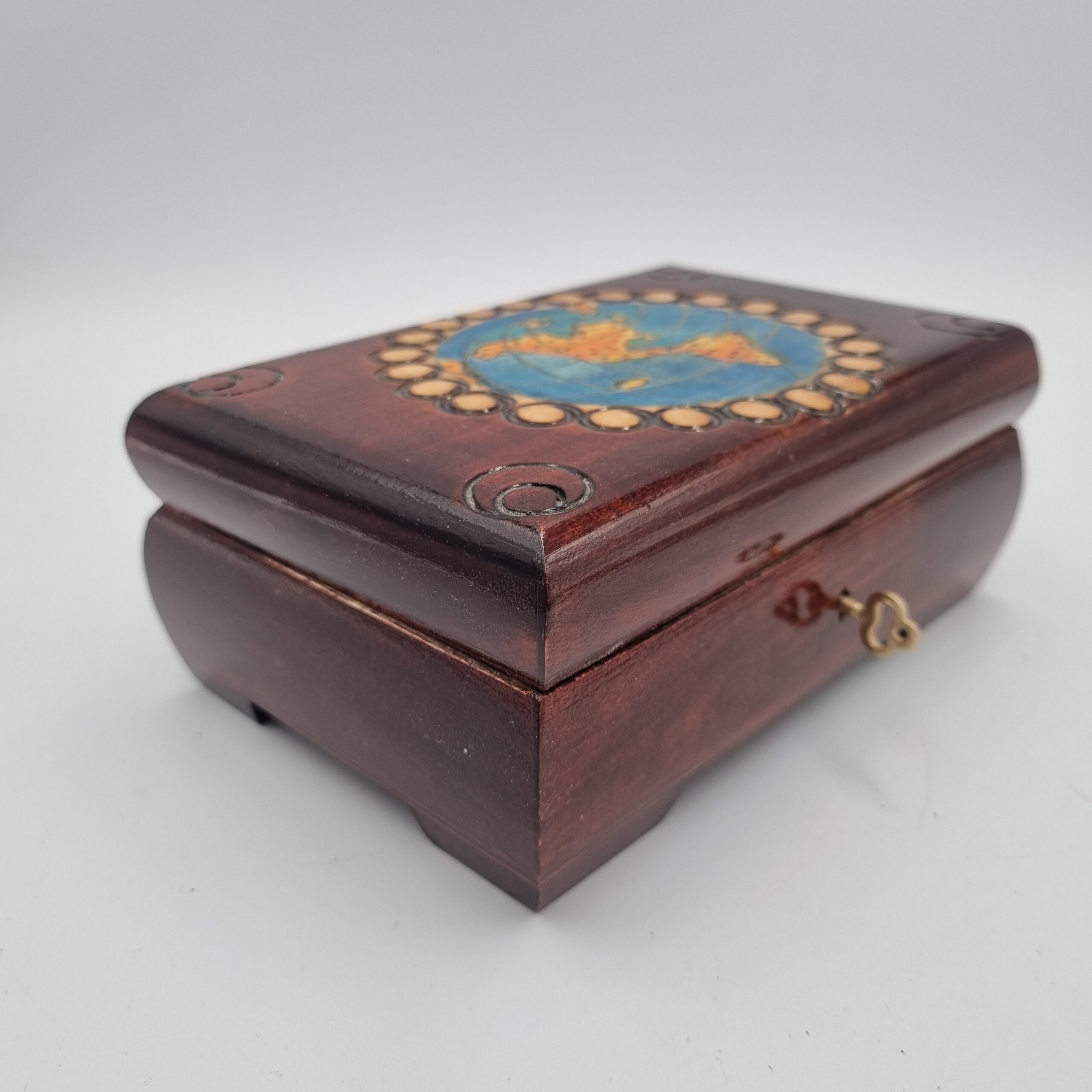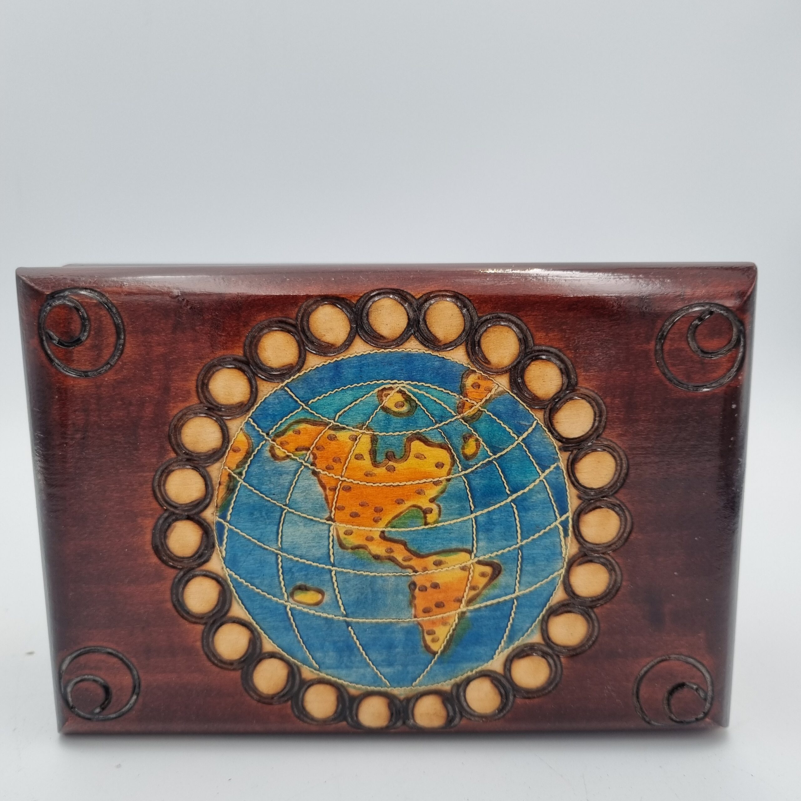 Wyjątkowa szkatułka typu pufka wykonana z naturalnego drewna zachwyca bogatym, ręcznie stylizowanym motywem map świata, precyzyjnie wypalanym w drewnie i uzupełnionym subtelną inkrustacją. To idealna propozycja dla miłośników geografii, podróży i oryginalnego wzornictwa. Każdy detal podkreśla kunszt wykonania oraz unikatowy charakter produktu.