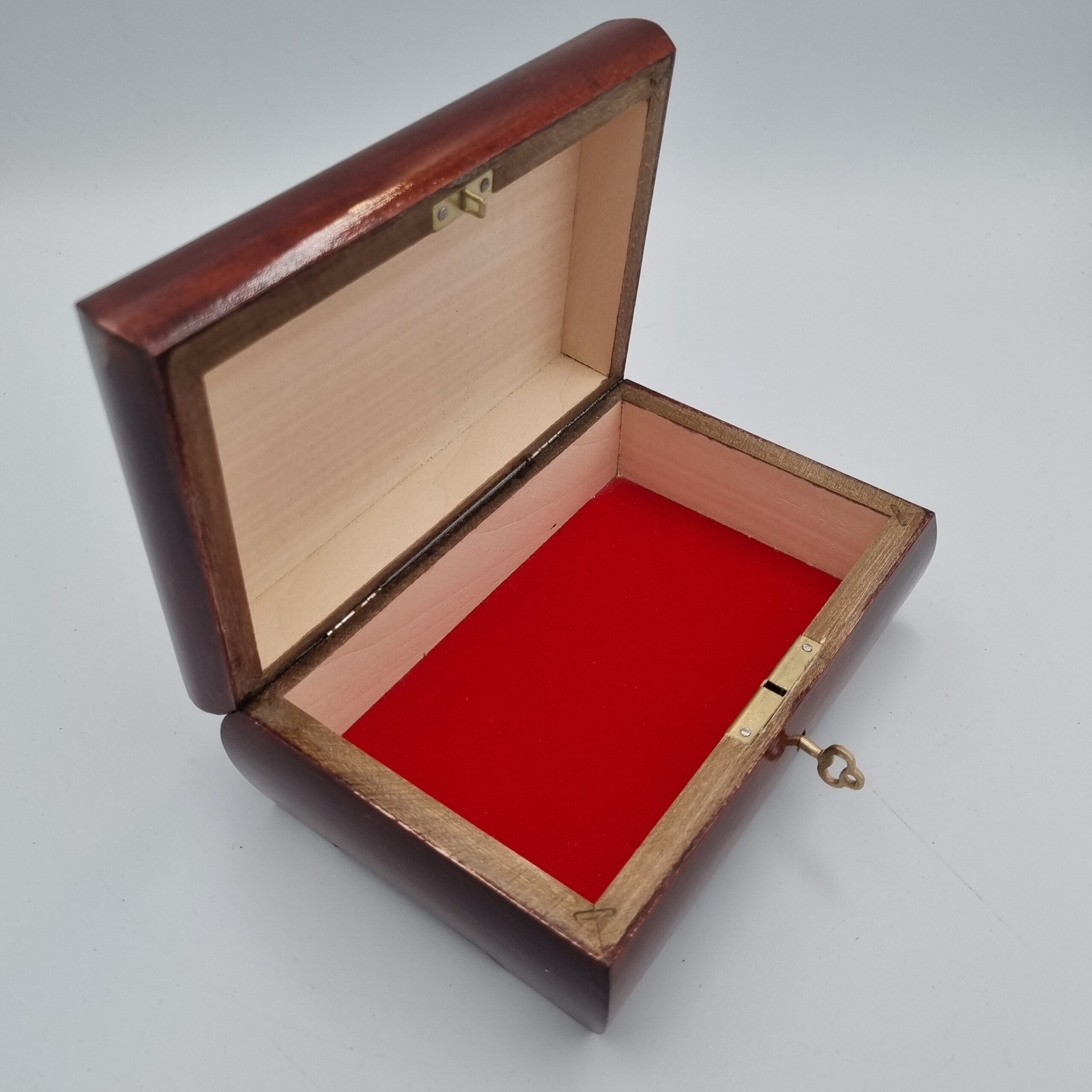 Powierzchnię szkatułki pokryto szlachetną, kolorową bejcą oraz lakierem o wysokim połysku, który wydobywa głębię barwy i naturalne piękno usłojenia drewna, nadając całości elegancki, luksusowy wygląd.