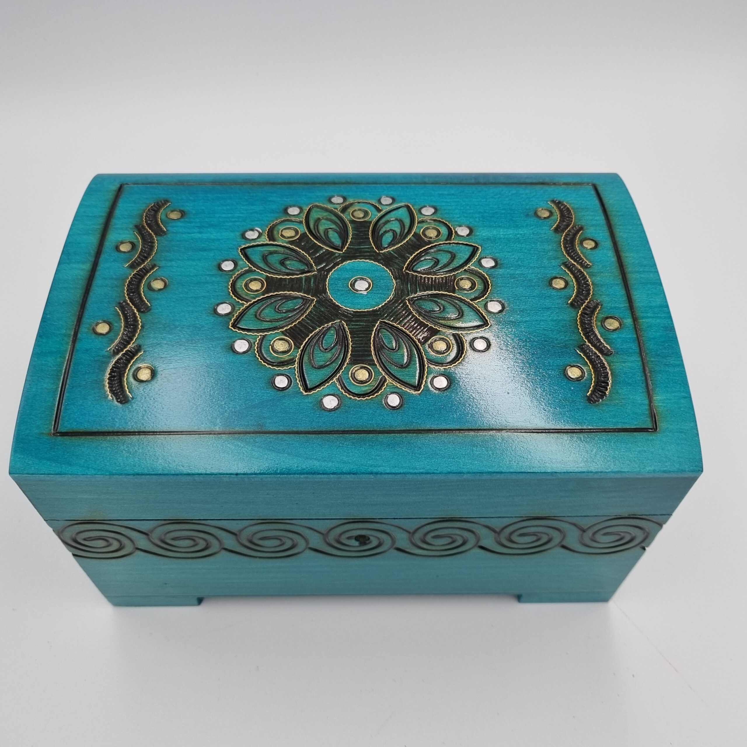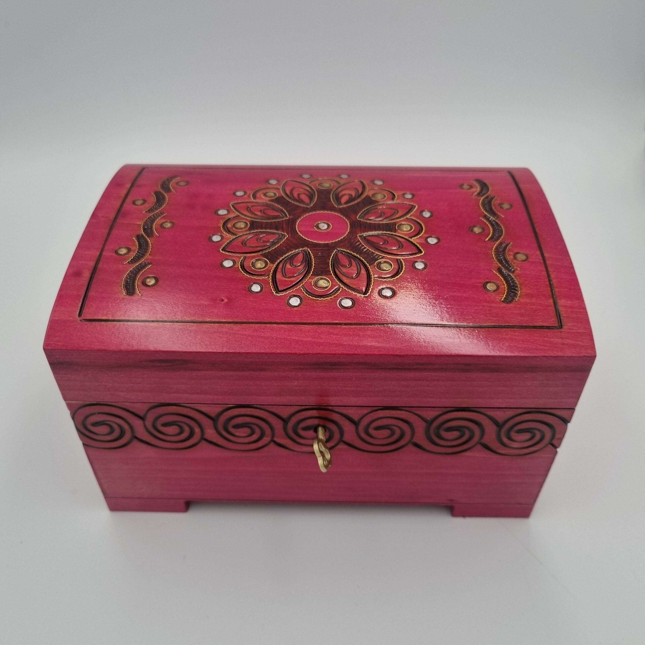 Elegancki drewniany kuferek zamykany na kluczyk to wyjątkowe połączenie tradycyjnego rzemiosła i dekoracyjnego wzornictwa. Wykonany z naturalnego drewna, zachwyca starannym wykończeniem oraz ozdobną rozetą powstałą w technice wypalania i inkrustacji.