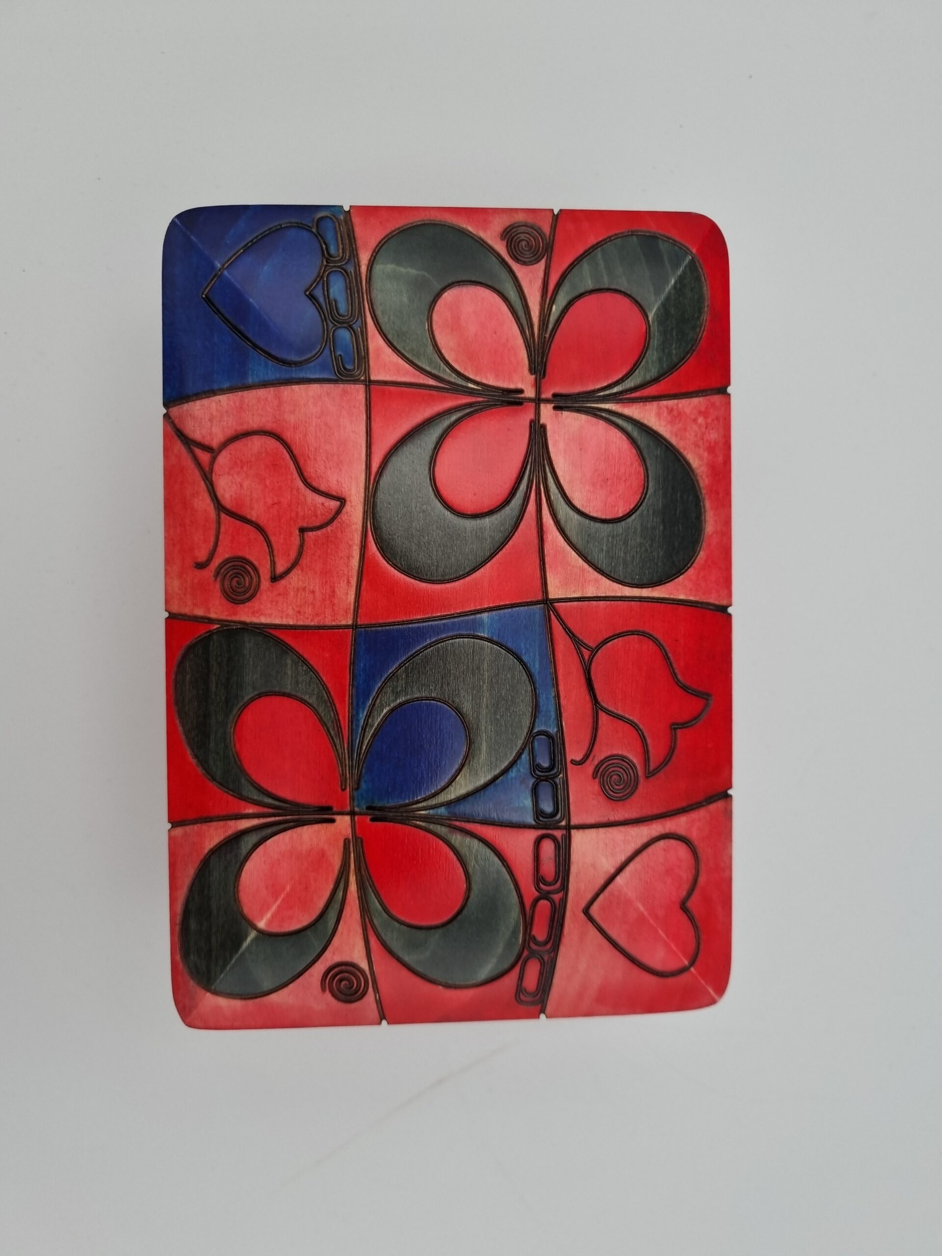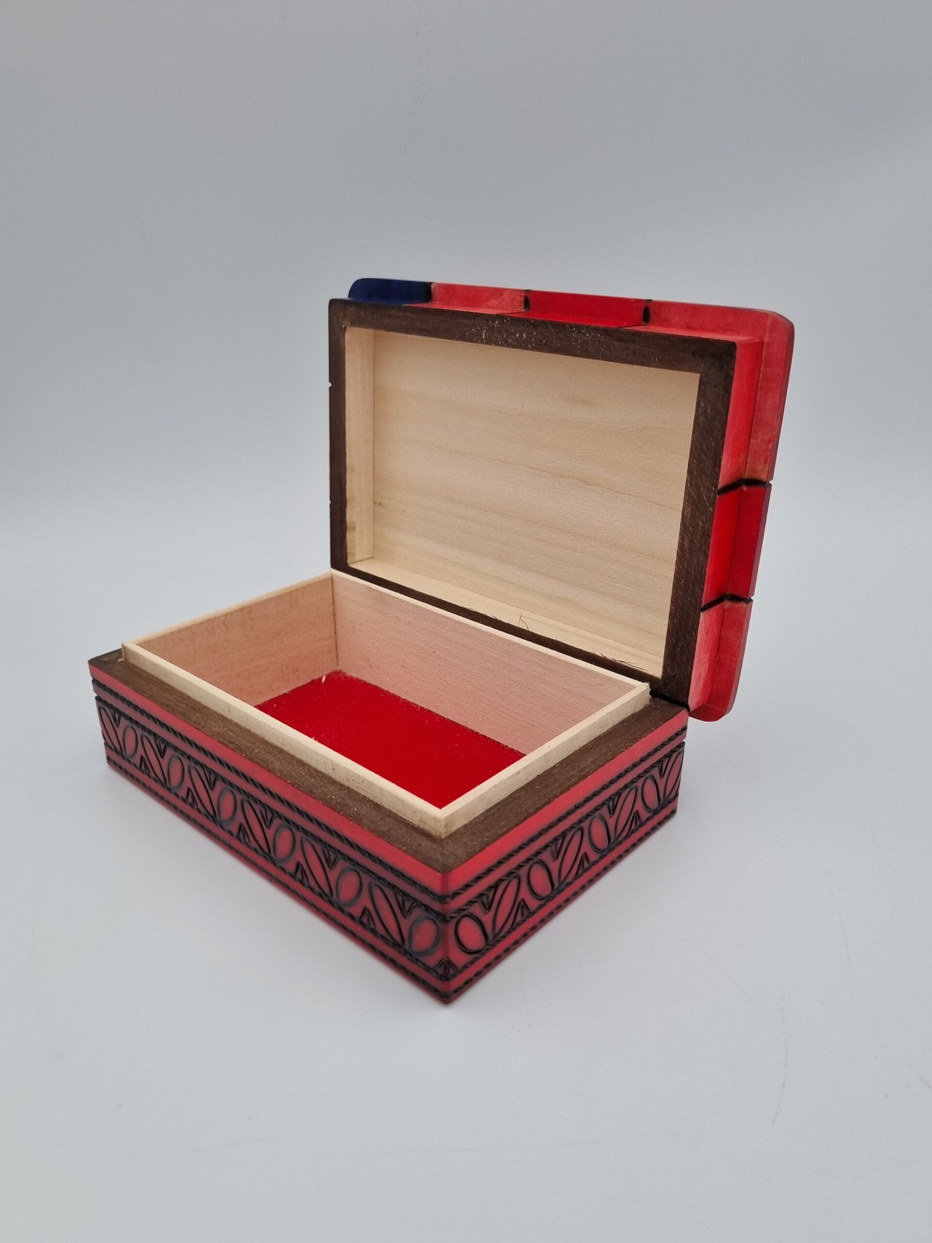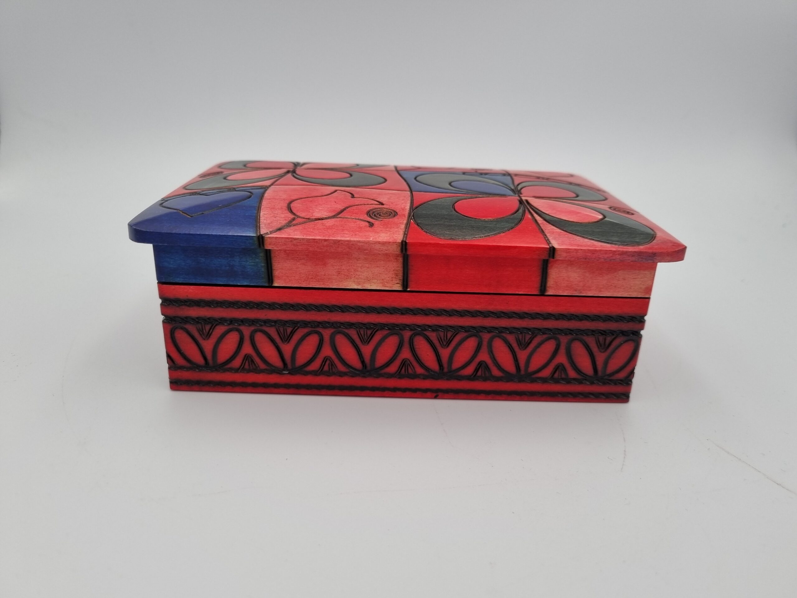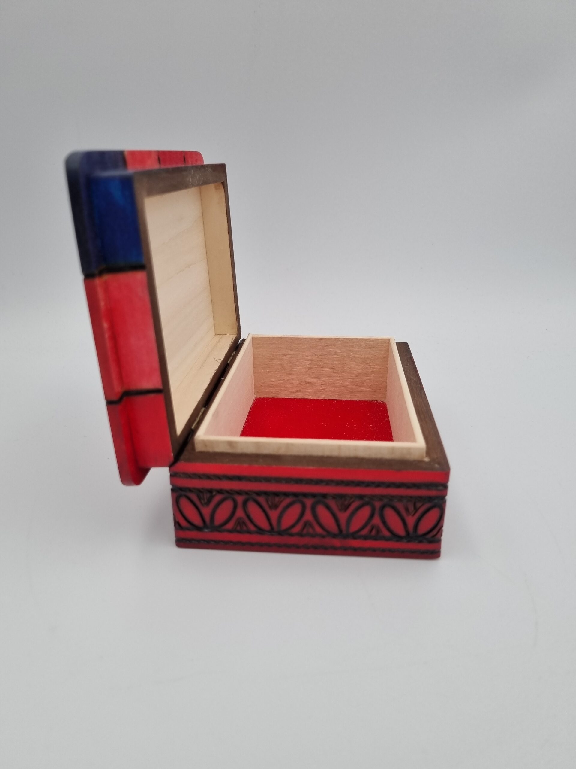Drewniana szkatułka wykonana z naturalnego drewna łączy w sobie prostotę formy z nowoczesnym, dekoracyjnym wykończeniem. Jej wieczko zdobi precyzyjnie wypalany wzór inspirowany kolorową mozaiką.